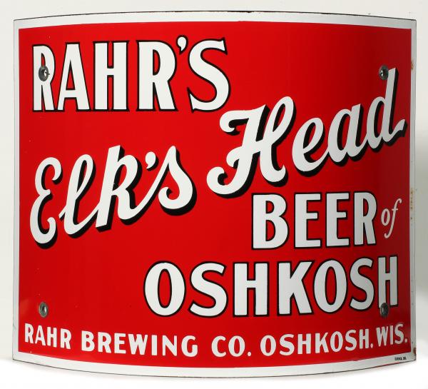 A PORCELAIN CORNER SIGN FOR RAHR'S ELK'S HEAD BEER