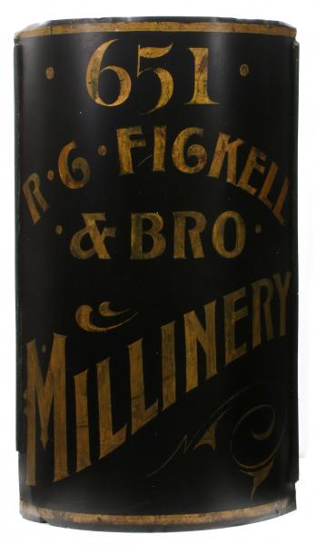 A 19TH CENTURY CORNER SIGN FOR R.C. FICKELL MILLINERY
