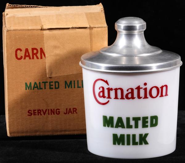 A CARNATION MALTED MILK SODA FOUNTAIN DISPENSER IN BOX