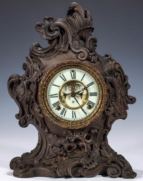 A VERY ORNATE ANSONIA CAST METAL ROCOCO STYLE CLOCK