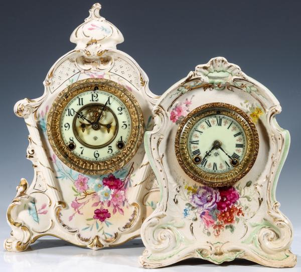 TWO NICE BLUE AND WHITE ROYAL BONN CASE ANSONIA CLOCKS