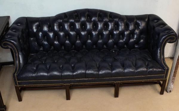 A BUTTON TUCKED CAMEL BACK SOFA WITH BRASS TACKS