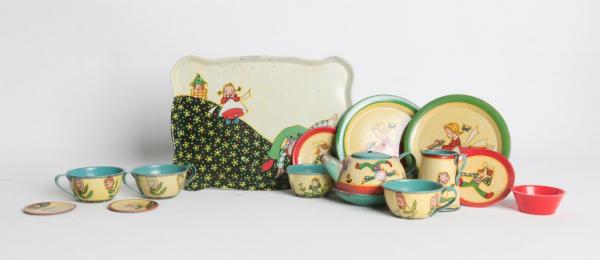A GROUP OF TIN LITHO CHILDREN'S DISHES AND TOYS