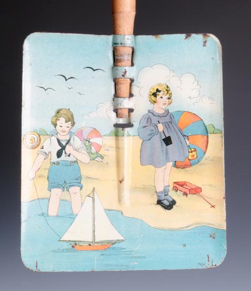 A TIN LITHO SEE-SAW SAND TOY AND NICE CHILD'S PAIL