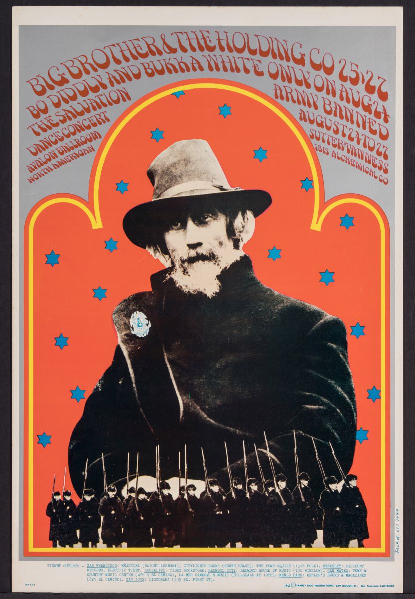 Printed signature lower right, dated 1967, performers Big Brother and the Holding Company, Bo Diddley, Bukka White and Salvation Army Banned.
