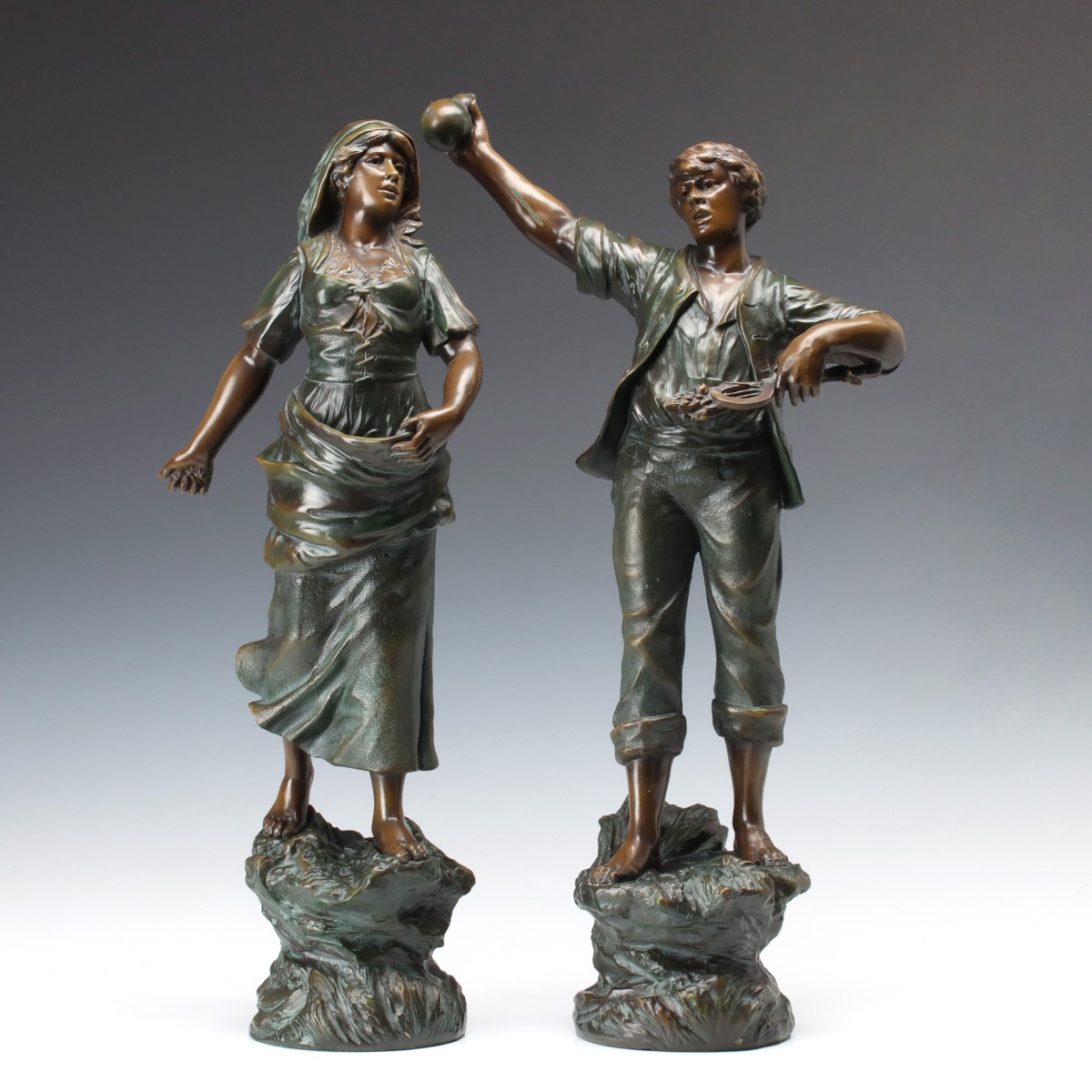 Home / Antique Clock and Music Box Auction / SPELTER FIGURES IN BROWN AND GREEN PATINA
