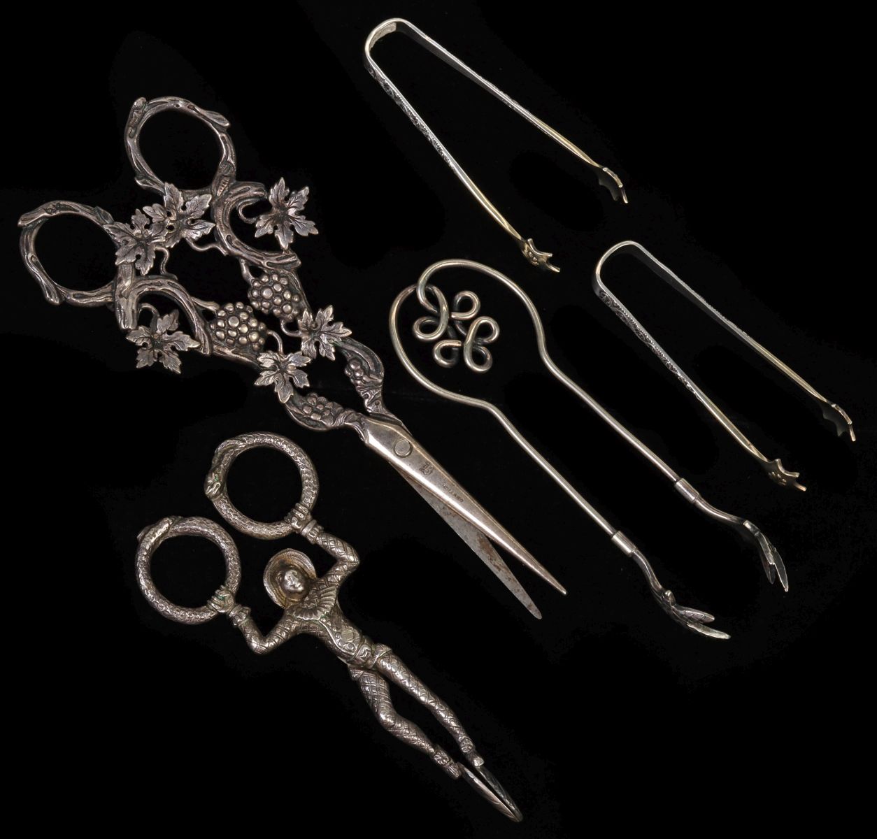 Home / May Multiple Estates Antique Auction / STERLING AND OTHER GRAPE SHEARS AND SUGAR TONGS