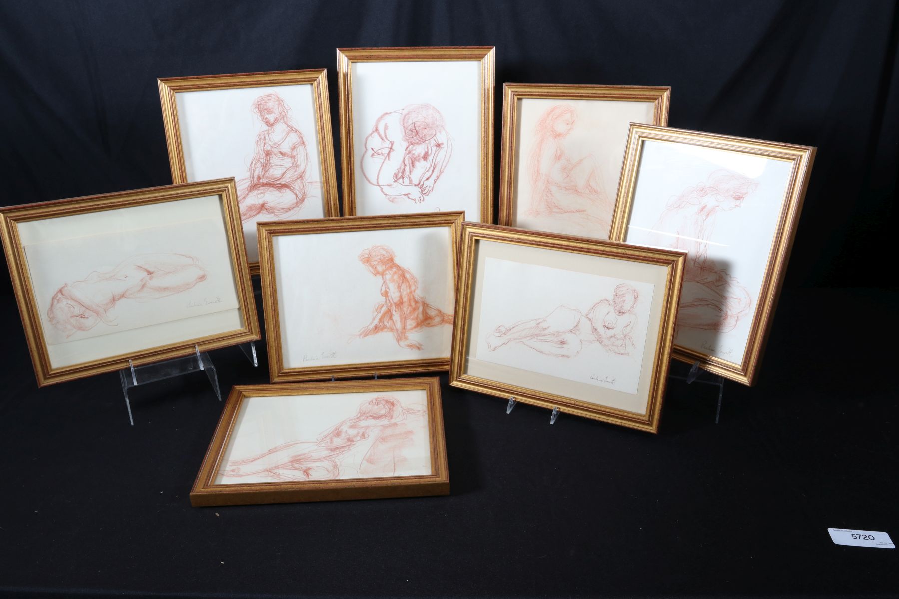 Seven framed pages from the artist's sketch book of figure studies in red conte crayon.