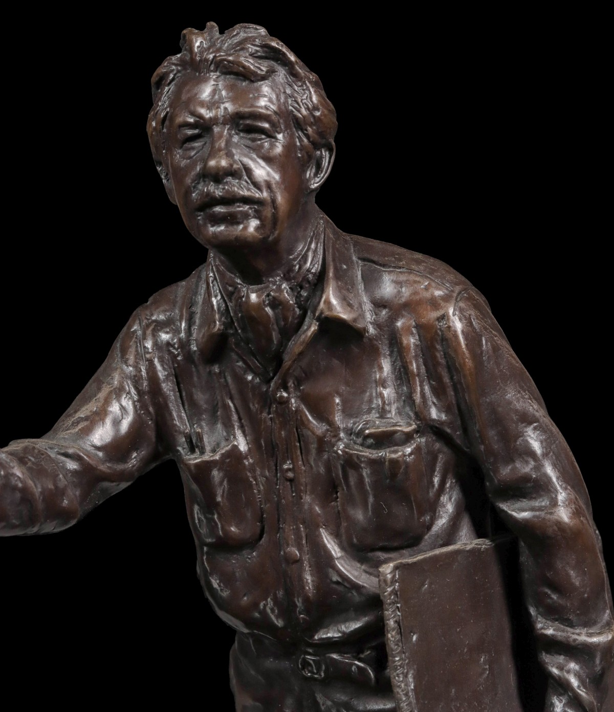 A rare bronze sculpture portrait of the American artist Thomas Hart Benton (1889 - 1975) in full stride with portfolio in hand, after the life-sized bronze installed on the campus of the Kansas City Art Institute in 1990. This model from an edition of 200 castings and numbered 28 of 200.