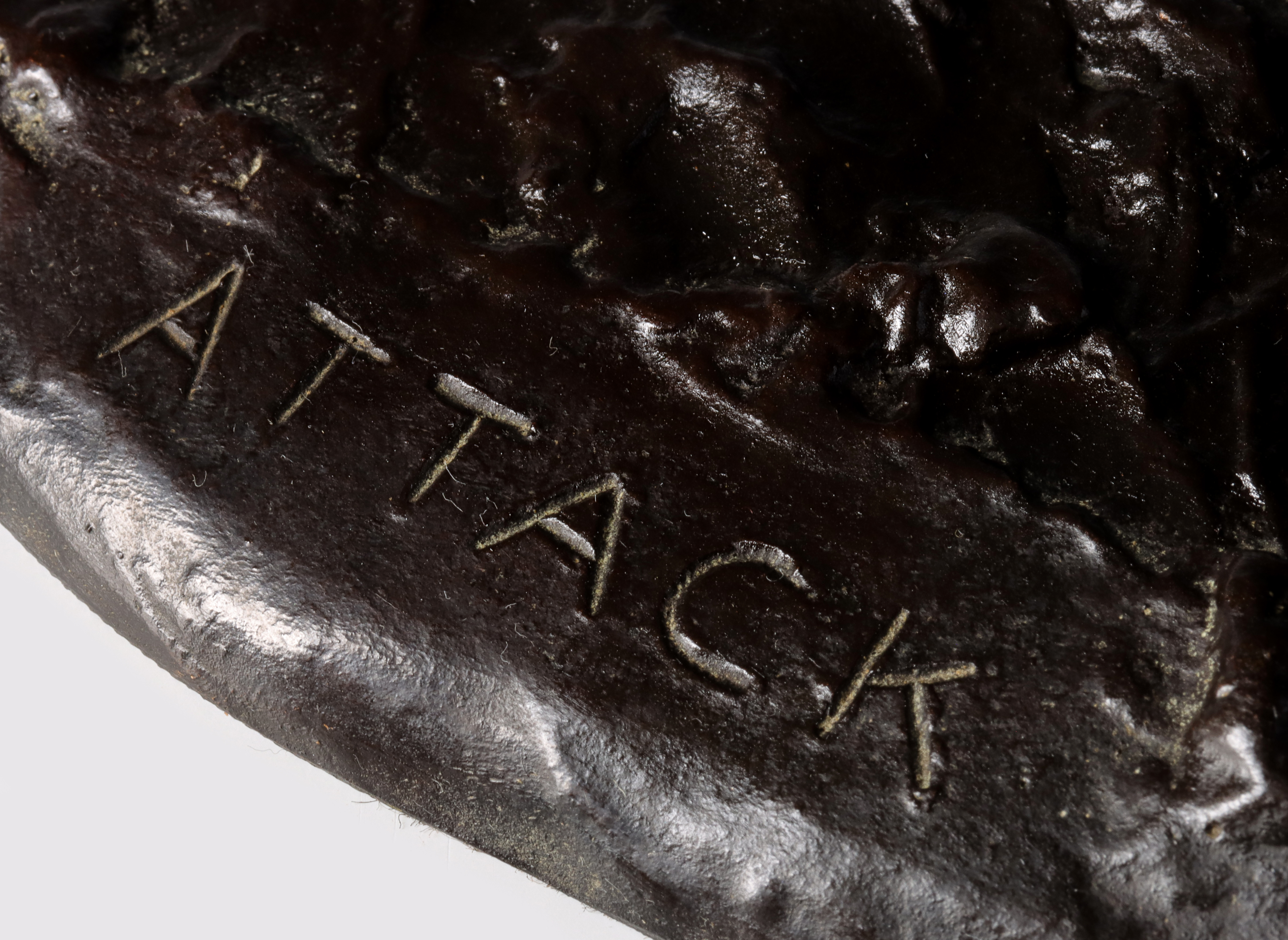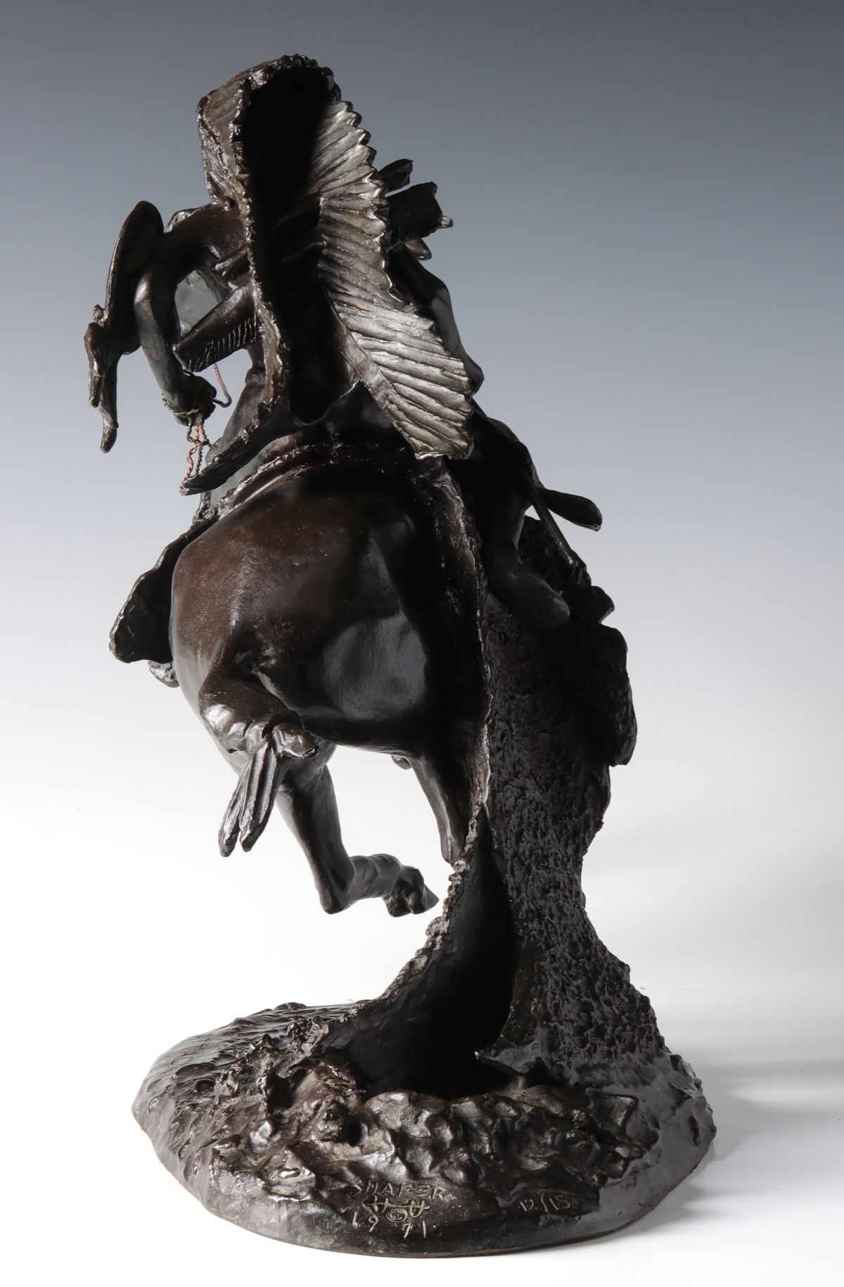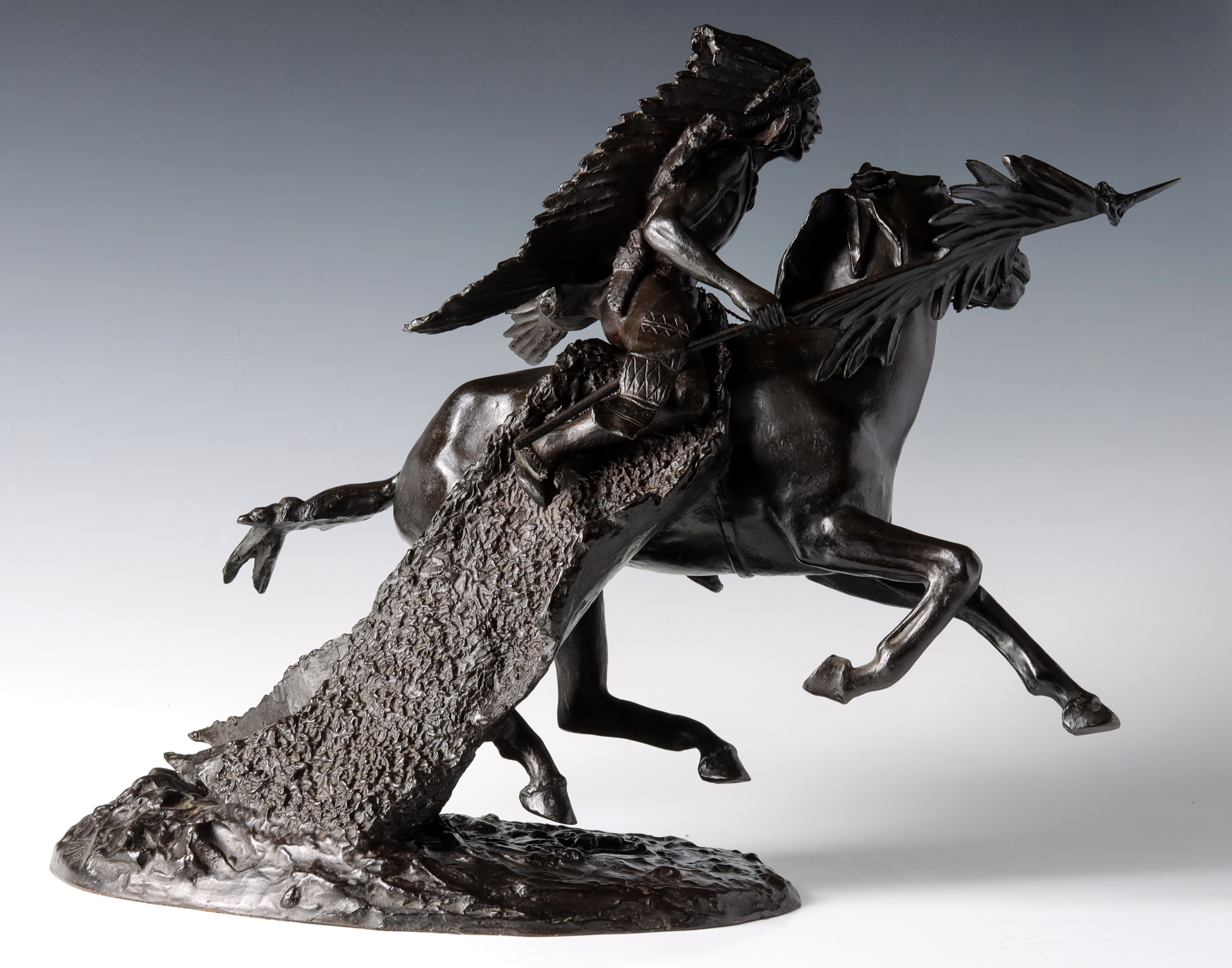 The dynamic composition of a charging Native American on horseback is signed, dated, titled, and numbered in the casting of 12 from only 15 sculptures produced.