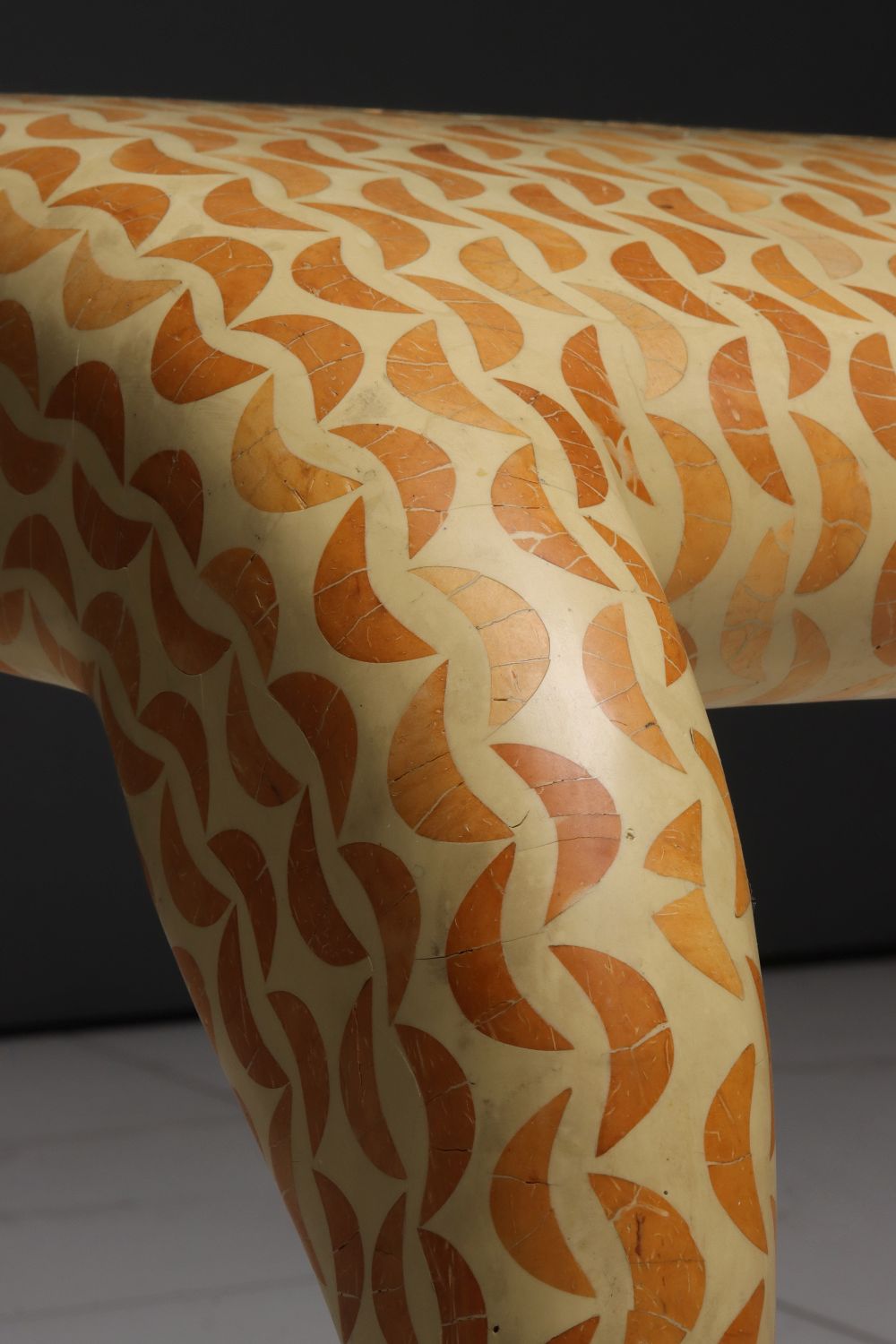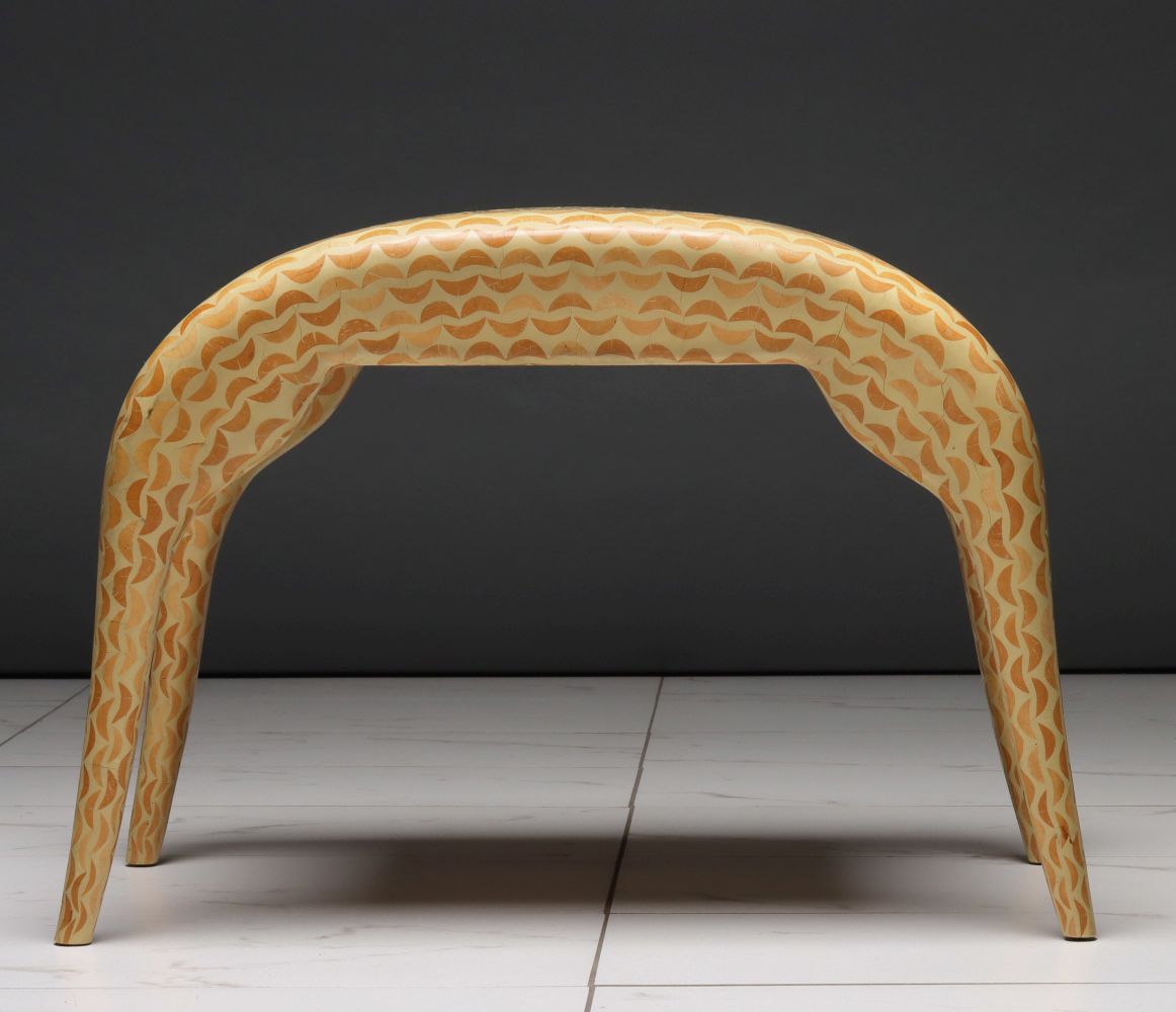 The inverted U-form stool of rhythmic, stylized design in undulating lines is finished with a mosaic of exotic inlays carved from coconut shell and inlaid in repeated linear design. The brass signature plaque of R&Y Augousti London is tacked to the underside. Examples of this form can easily be found. Nothing in the extensive line of Augousti luxury items could be found with this striking finish, pattern, or palette.