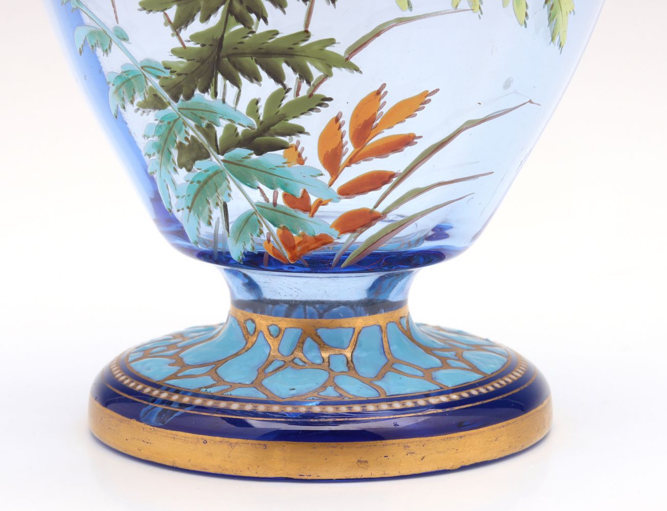 The inverted teardrop form in blue crystal is sparsely decorated with colorful enamel depictions of wildflower sprays, and embellished with an applied glass salamander in bas relief with enamel spots. The top of the foot is finished in an interesting enameling technique that emulates champleve' metalwork.