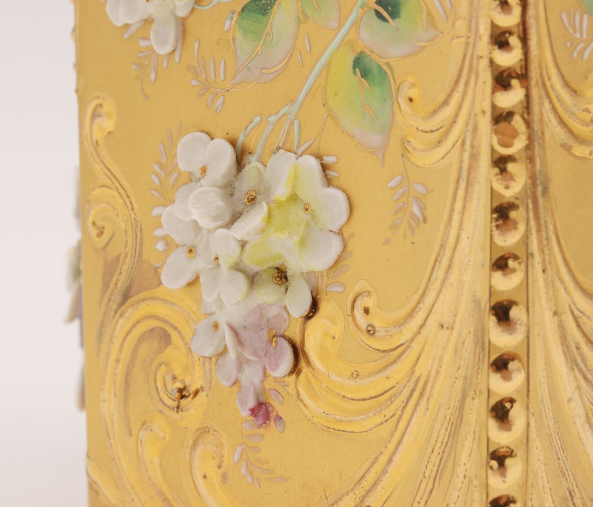 The jug of flattened form with applied handle is decorated with tiny applied flower petals in high relief on gold encrustation with rococo swirls and rocaille motif surrounding a colorless crystal window on each side embellished with clear enamel beaded flower heads centered by gold, accented by a polychrome enamel bird in relief.