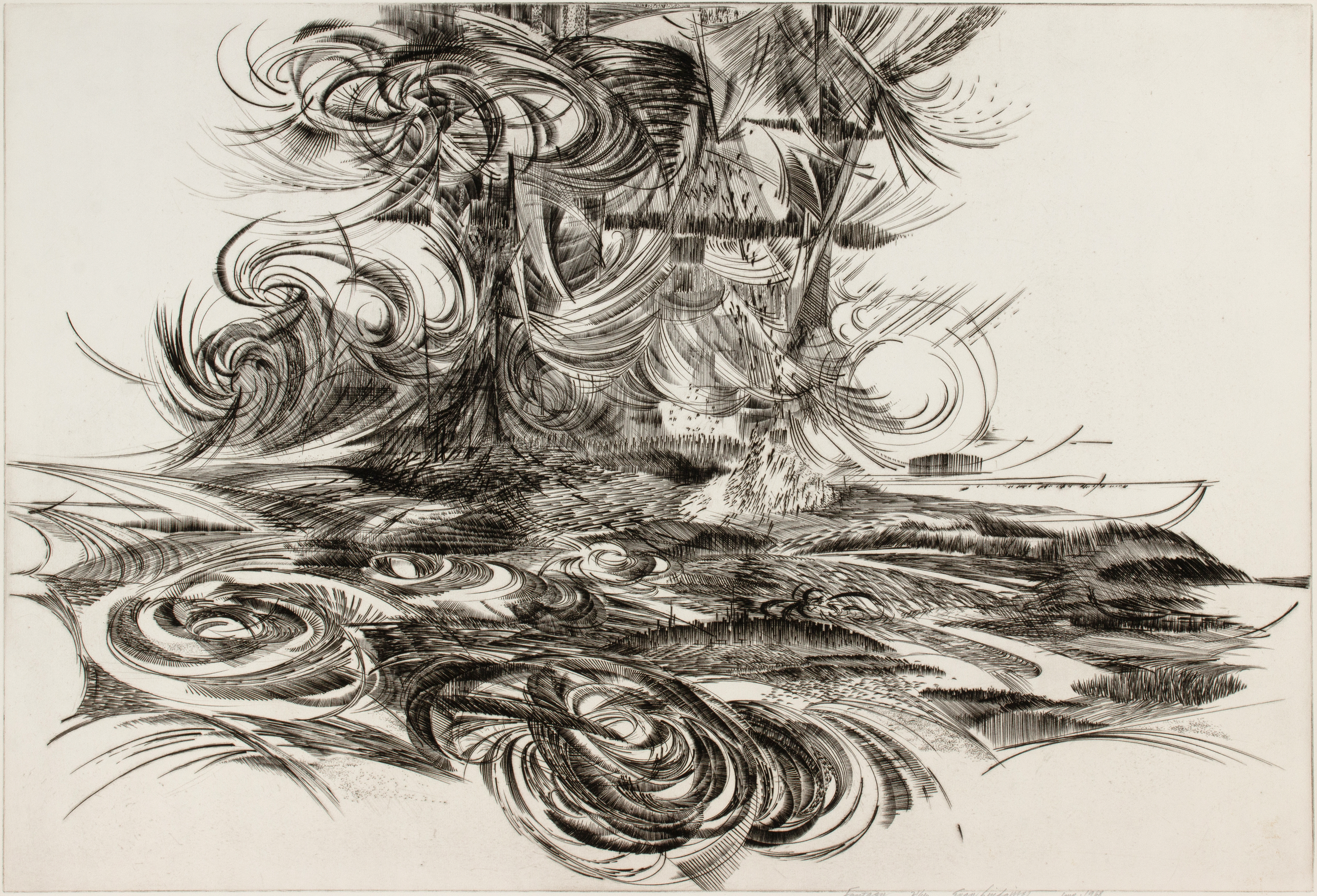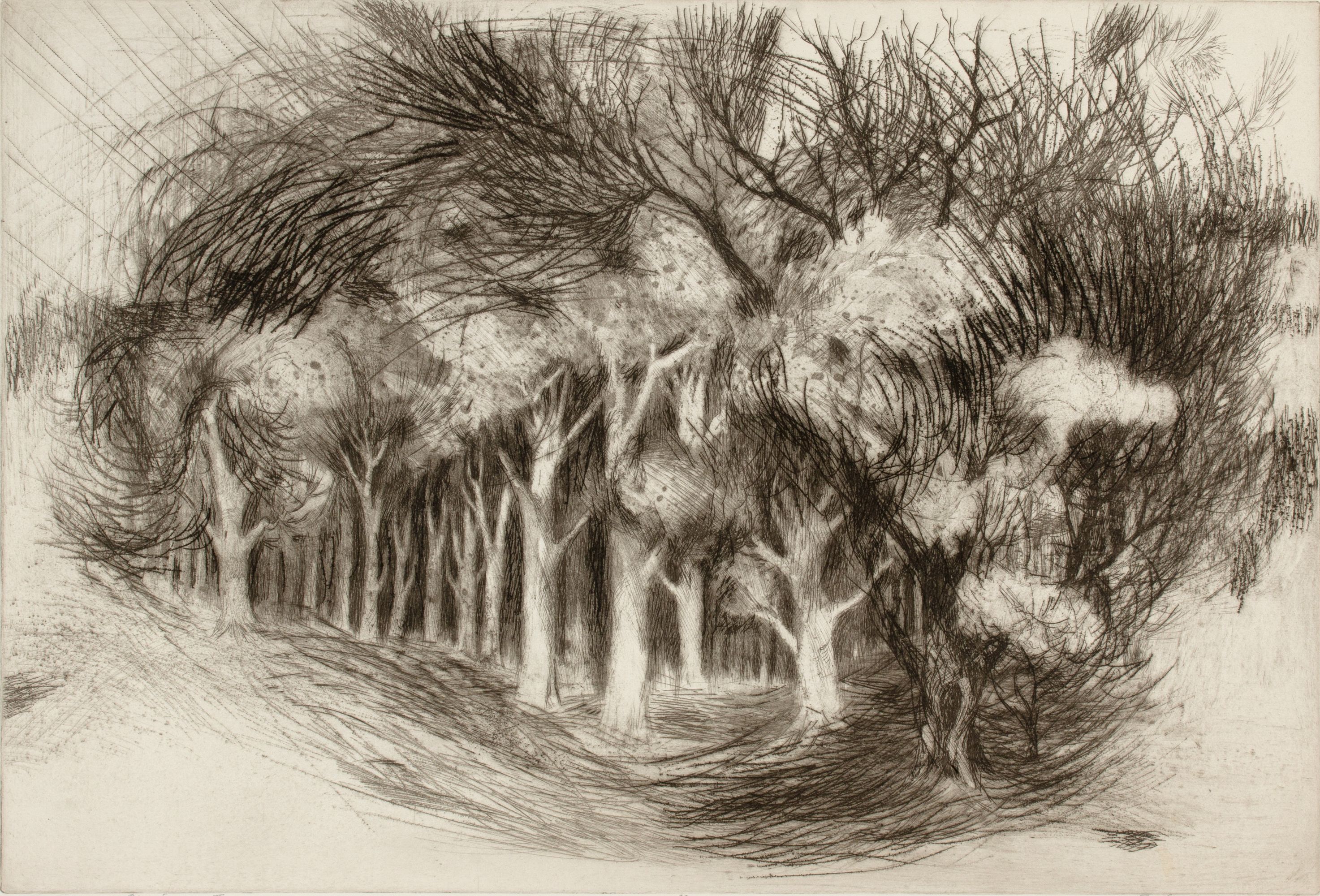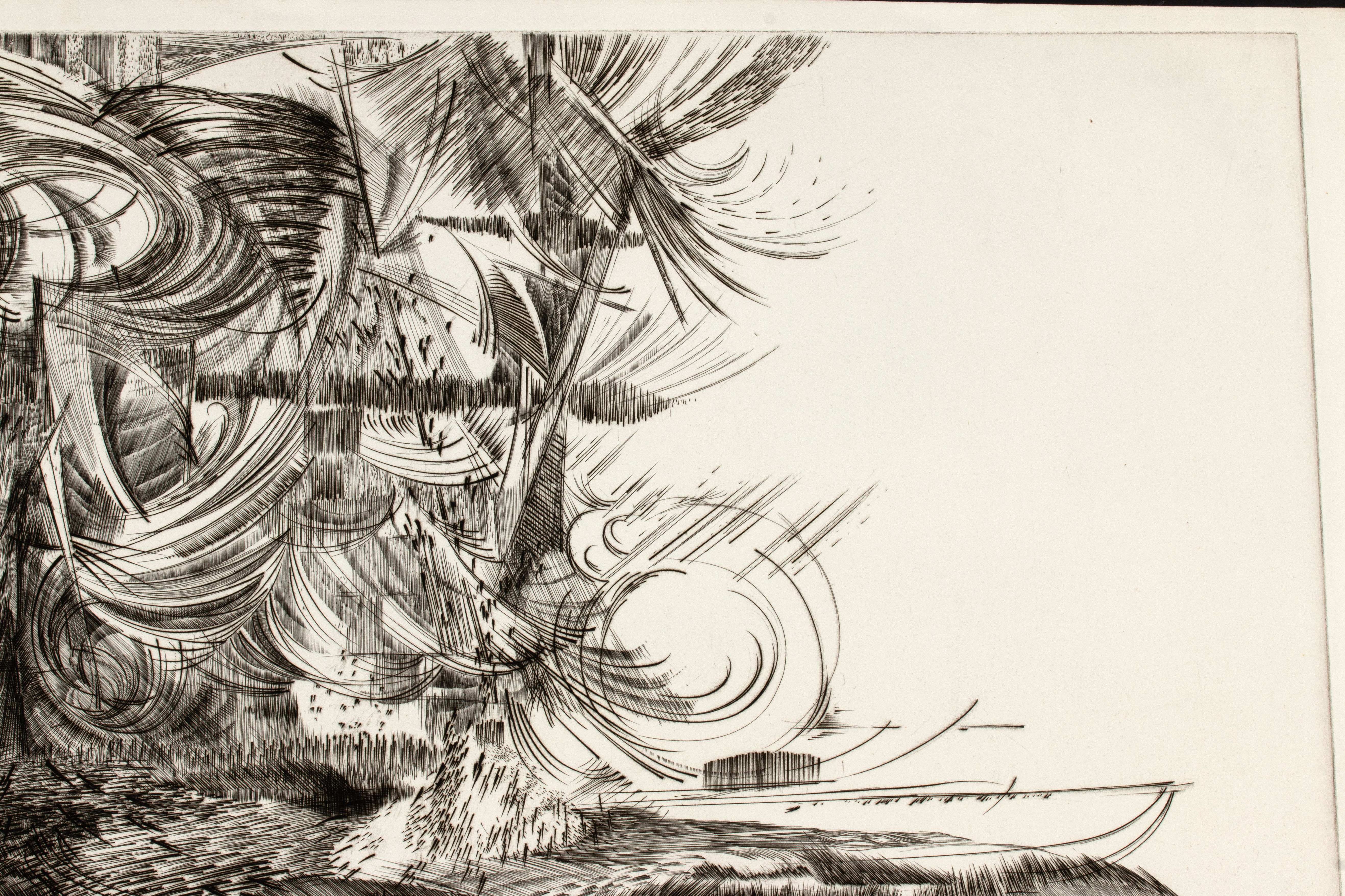 4) Evan Lindquist (Arkansas, 1936-2023) Deep Summer II, The drypoint etching, numbered 21 in an edition of 40 prints is titled and signed by the artist in pencil below the image lower center. Image measures 23.5 x 34.75, sheet is 25 x 38.5 inches.