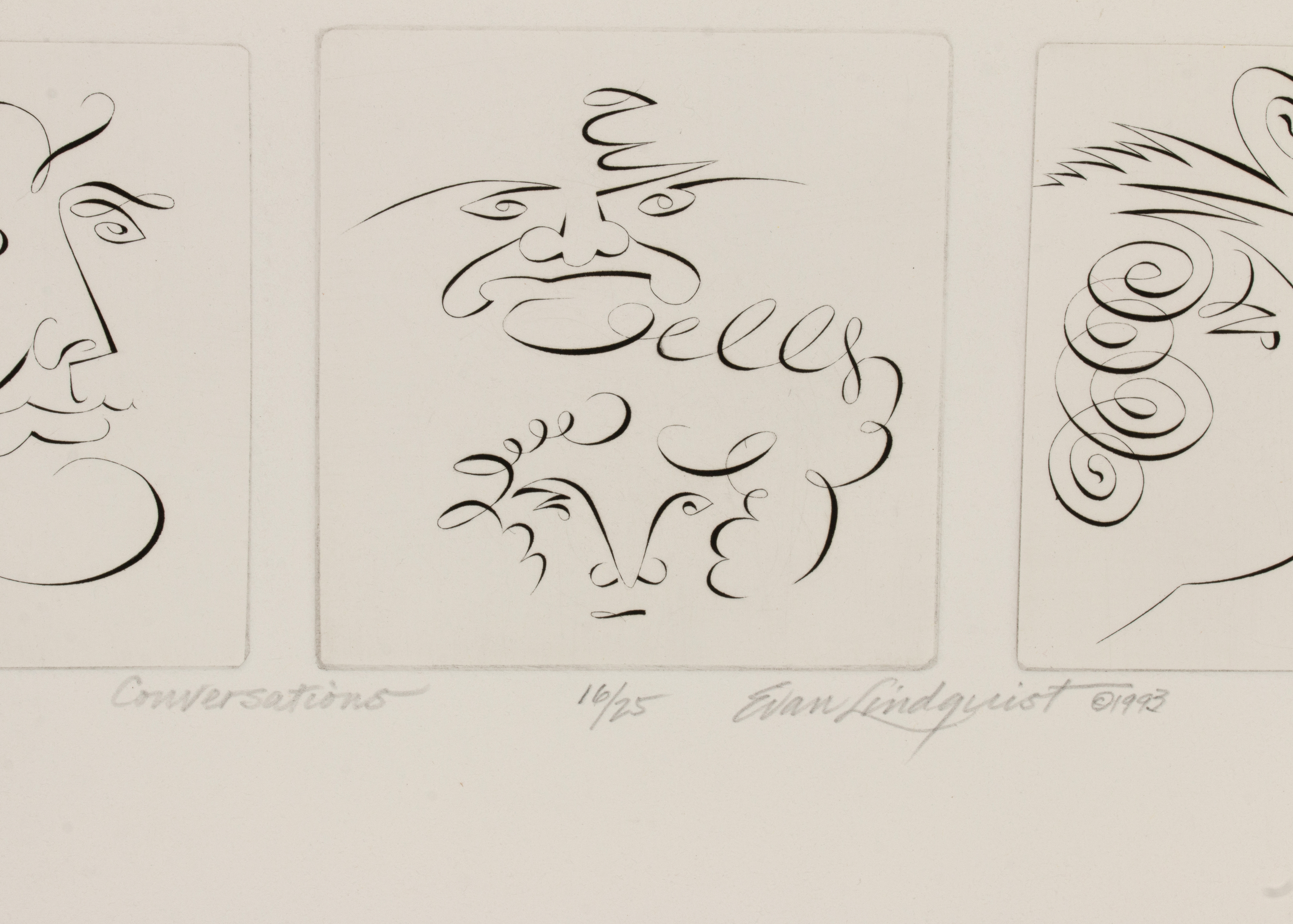 4) Conversations (1993). The drypoint etching, numbered 16 in an edition of 25 prints, is titled and signed by the artist in pencil below the image lower center.