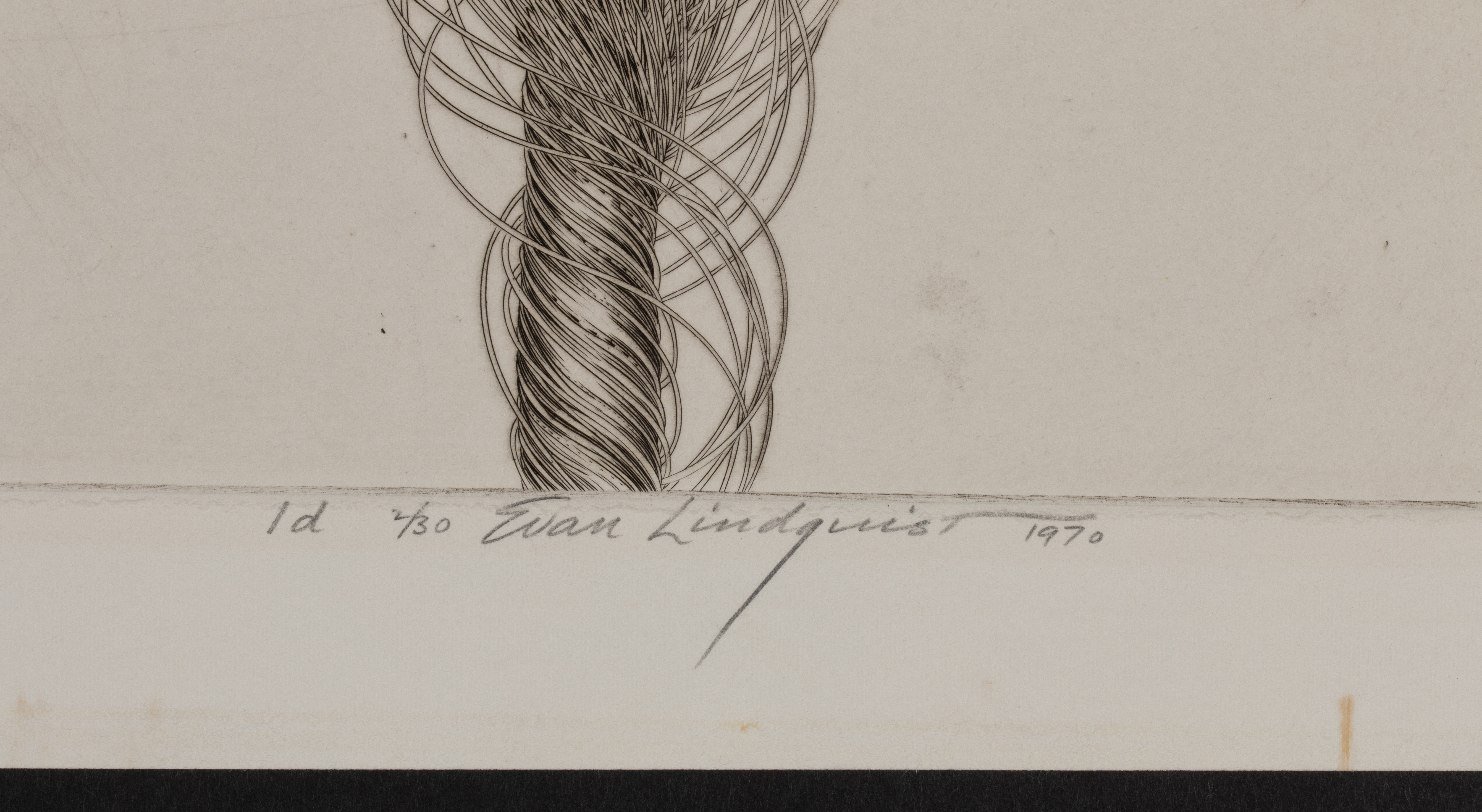 5) Three Skeins (1969). The drypoint etching, numbered 12 from an edition of 40 prints, is titled and signed by the artist in pencil below the image lower center.