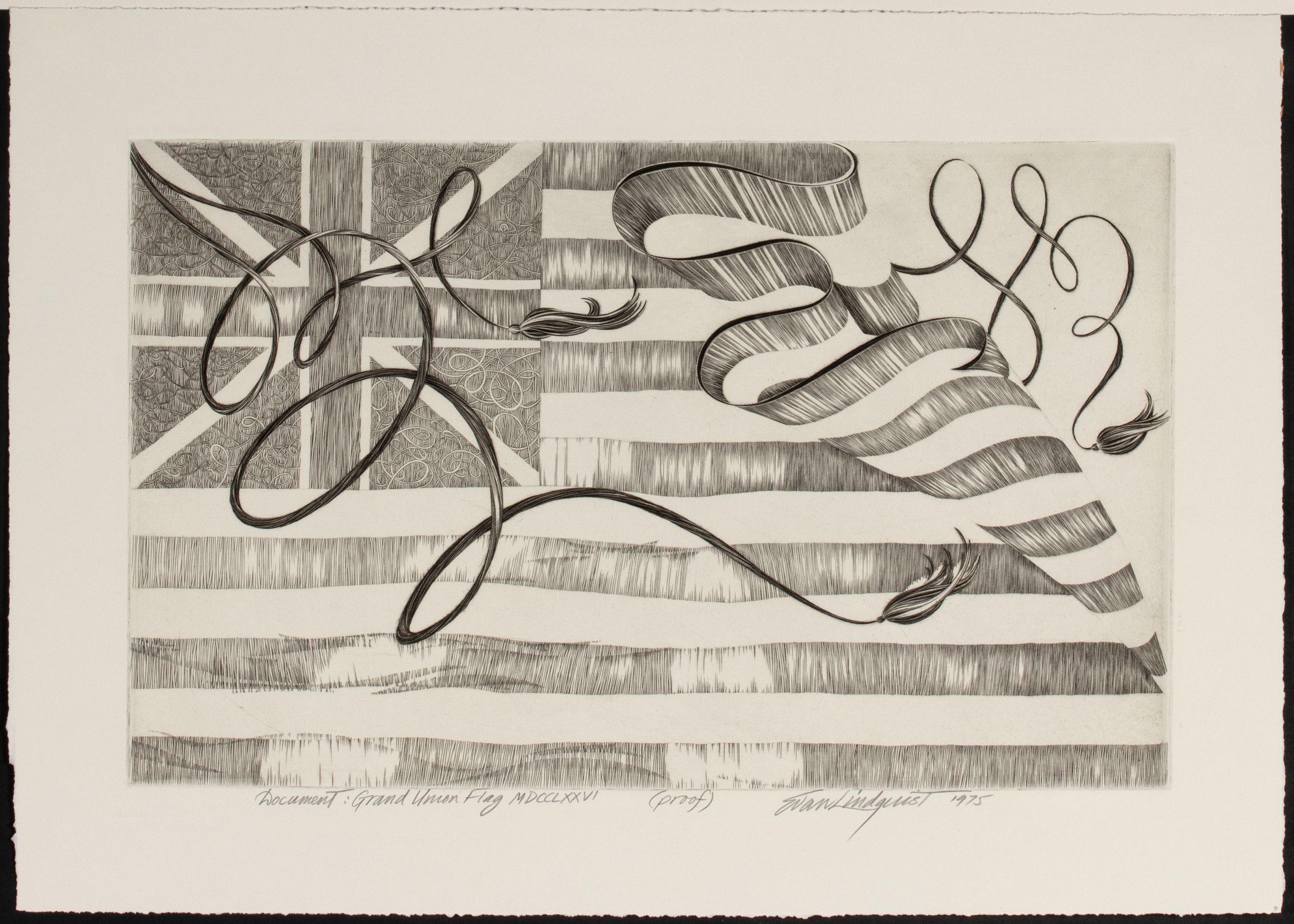 2) Document: Grand Union Flag MDCCLXXVI (1975). The drypoint etching, noted as an artist's proof, is titled and signed by the artist in pencil below the image lower center.
