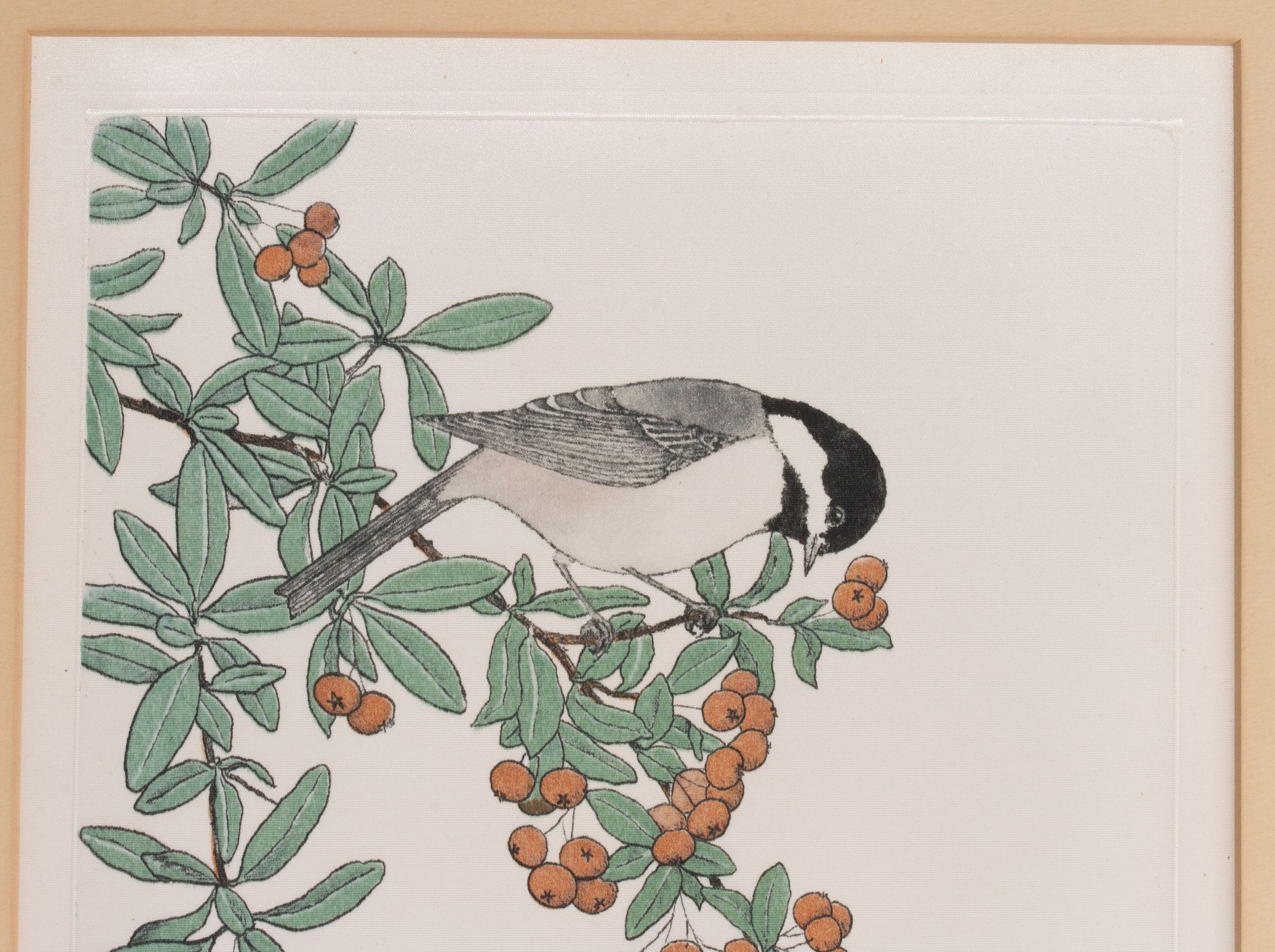 3) Chickadee (1967) The color etching on silk is numbered 8 from an edition of 150, signed and dated by the artist in pencil below the image lower right and titled lower left.