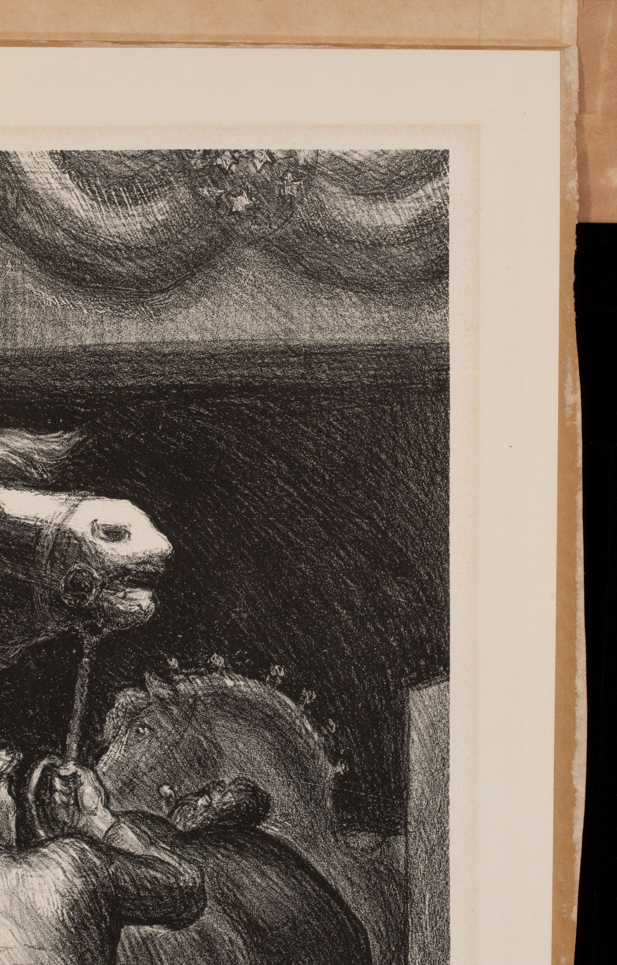 The lithograph from an edition of 250 prints published by Associated American Artists is based on a 1942 painting titled Prize Belgians. This print is signed by the Curry in pencil below the image lower right and titled lower left just below the artist's initials and a date in the plate.