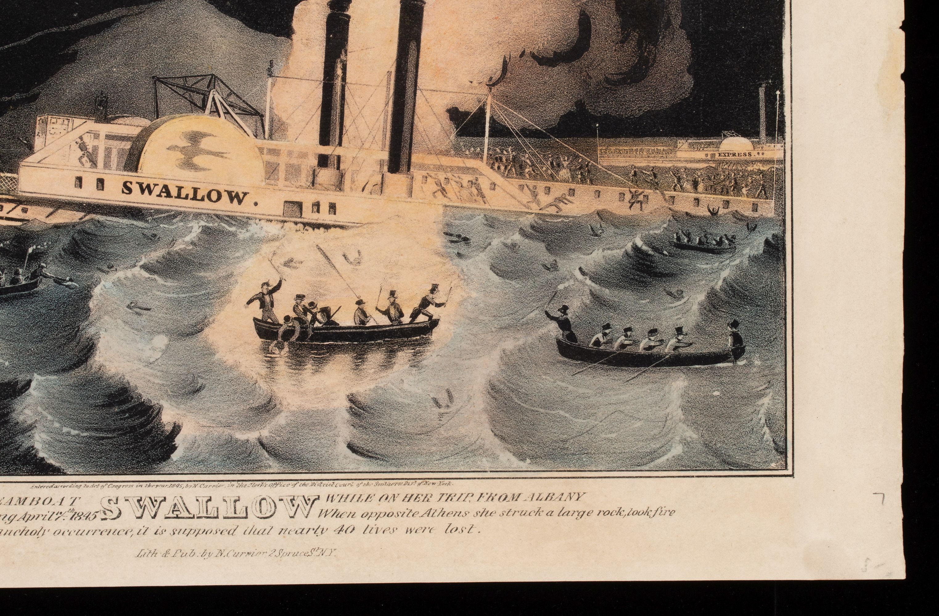 1) Loss of the Steamboat Swallow (Circa 1845) The hand-colored lithograph, 'Loss of the Steamboat Swallow while on her trip from Albany to New-York, on Monday Evening April 7th, 1845. When opposite Athens she stuck a large rock, took fire, broke in two and sunk. By which melancholy occurrence, it is supposed that nearly 40 lives were lost.' Printed publisher signature Nathaniel Currier lower center.