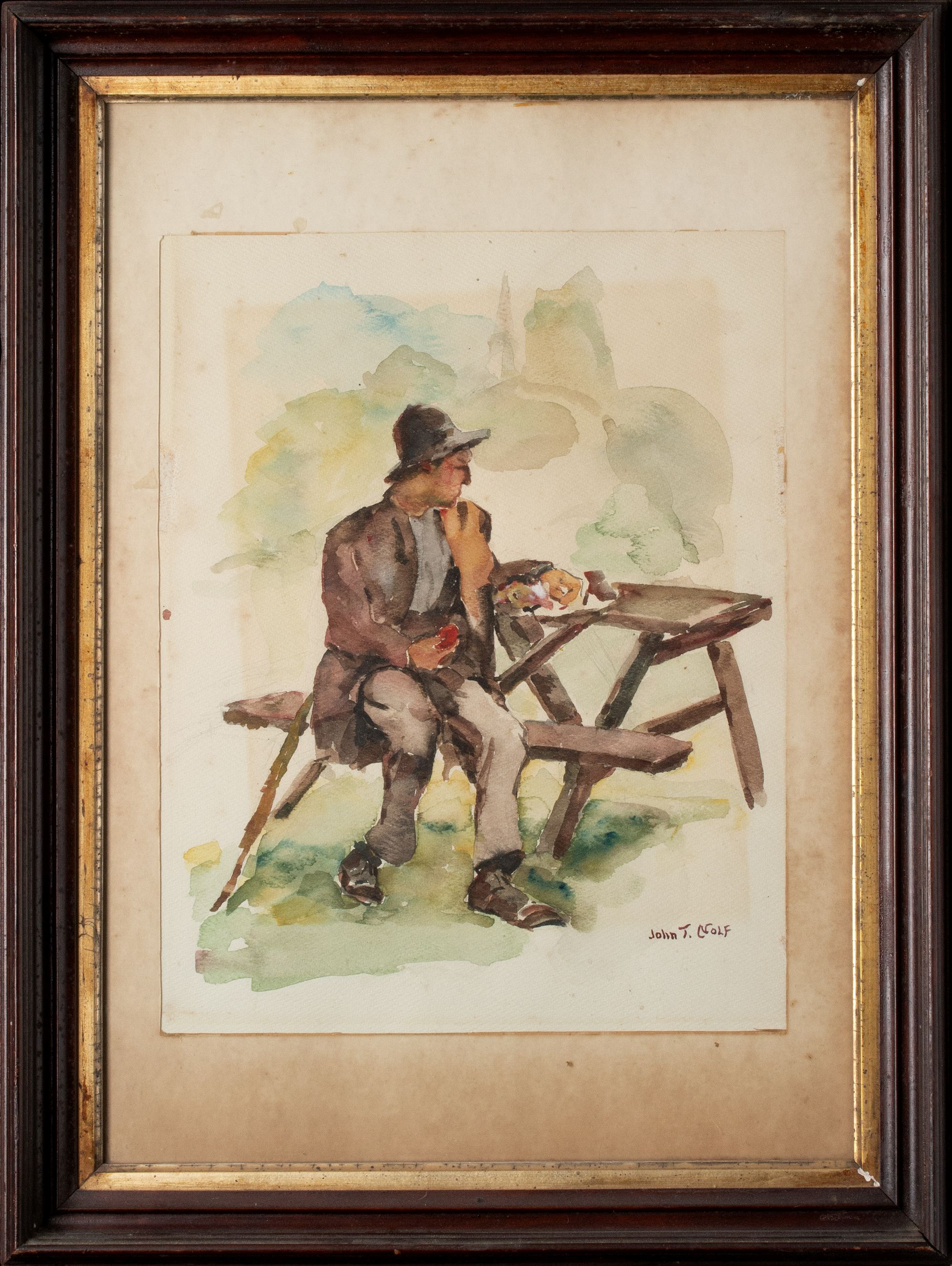 John Thomas Nolf, short-term resident of Joplin, Missouri and many other locales, lived a pretty colorful life before becoming an artist. Winnings from a poker game bought him a first class ticket to Chicago where he attended the Chicago Art Institute, launching his career as an artist, an illustrator and a teacher. He is most associated with the quaint Illinois village of Grand Detour, home of the Grand Detour Artist's Colony to which he described himself as mayor. Others, it has been reported, described him as 'Will Rodgers without the chewing gum and lariat.' Biographers also report that the people and places around Grand Detour often provided inspiration for Nolf's paintings. That may explain the strong similarities of the barnyard plot in this composition, and another in this auction,