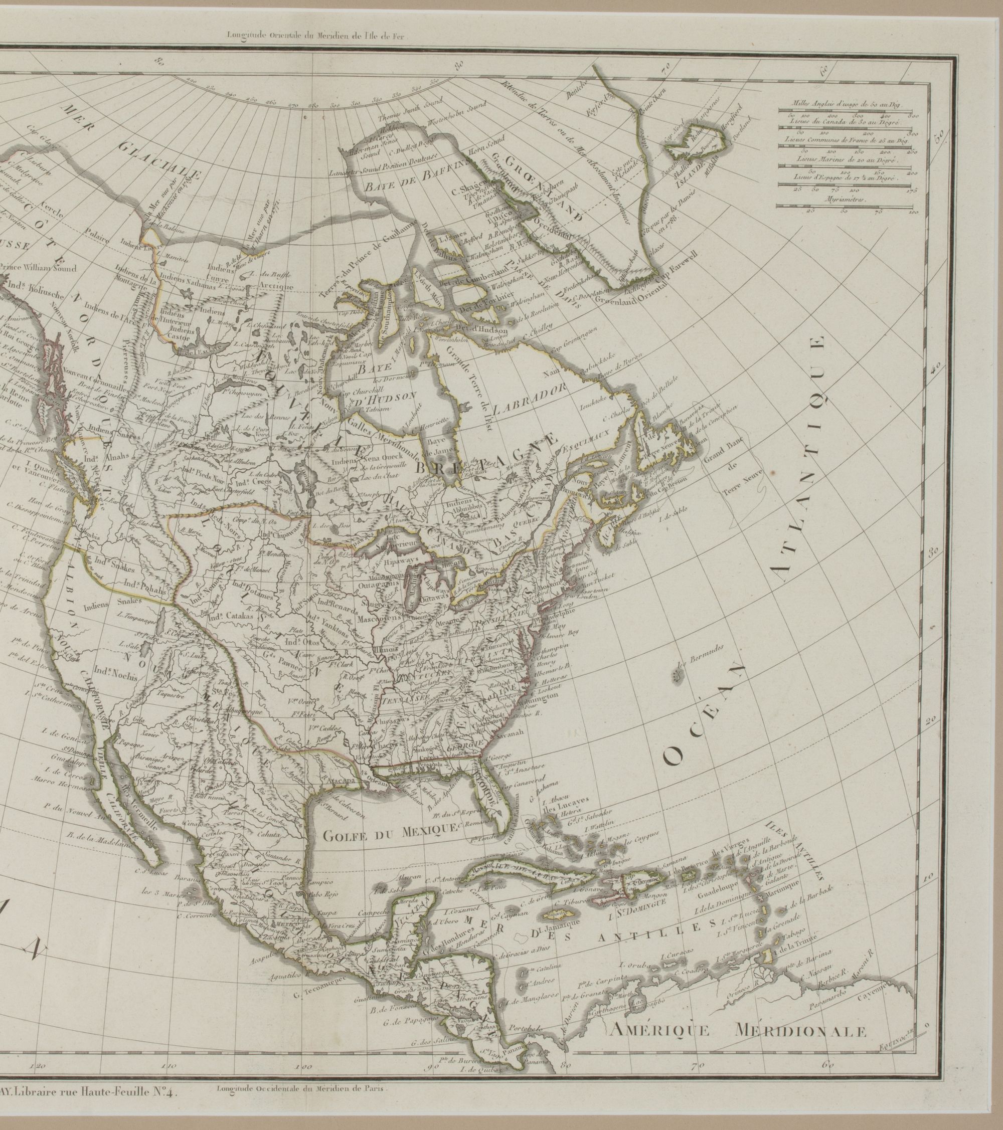 AMERIQUE SEPTENTRIONALE by Jean Baptiste Poirson mapping North America in the period of the Louisiana Purchase with unusual and interesting detail listing dozens and dozens of obscure Indian tribes and their locations, with interesting identification of America's western lands and the oceans surrounding the continent.