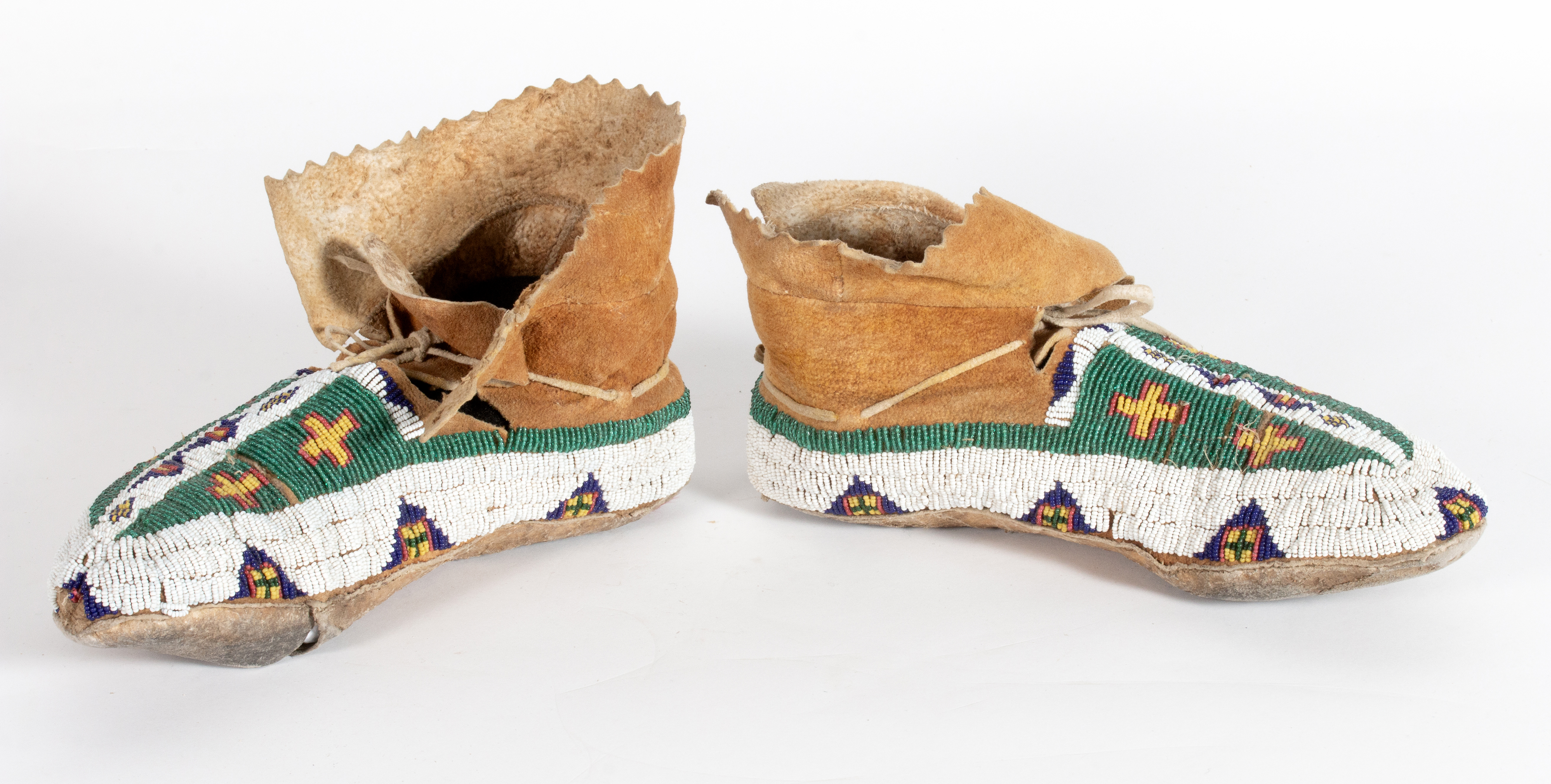 The classic Northern Plains pair, possibly Lakota Sioux, with fold-over cuffs having a sawtooth edge, are decorated in sinew sewn lazy stitch glass trade beads of blue, white, translucent green, opaque green seed, yellow and whiteheart red creating motifs of floating crosses and 'buffalo tracks' above the parfleche soles.