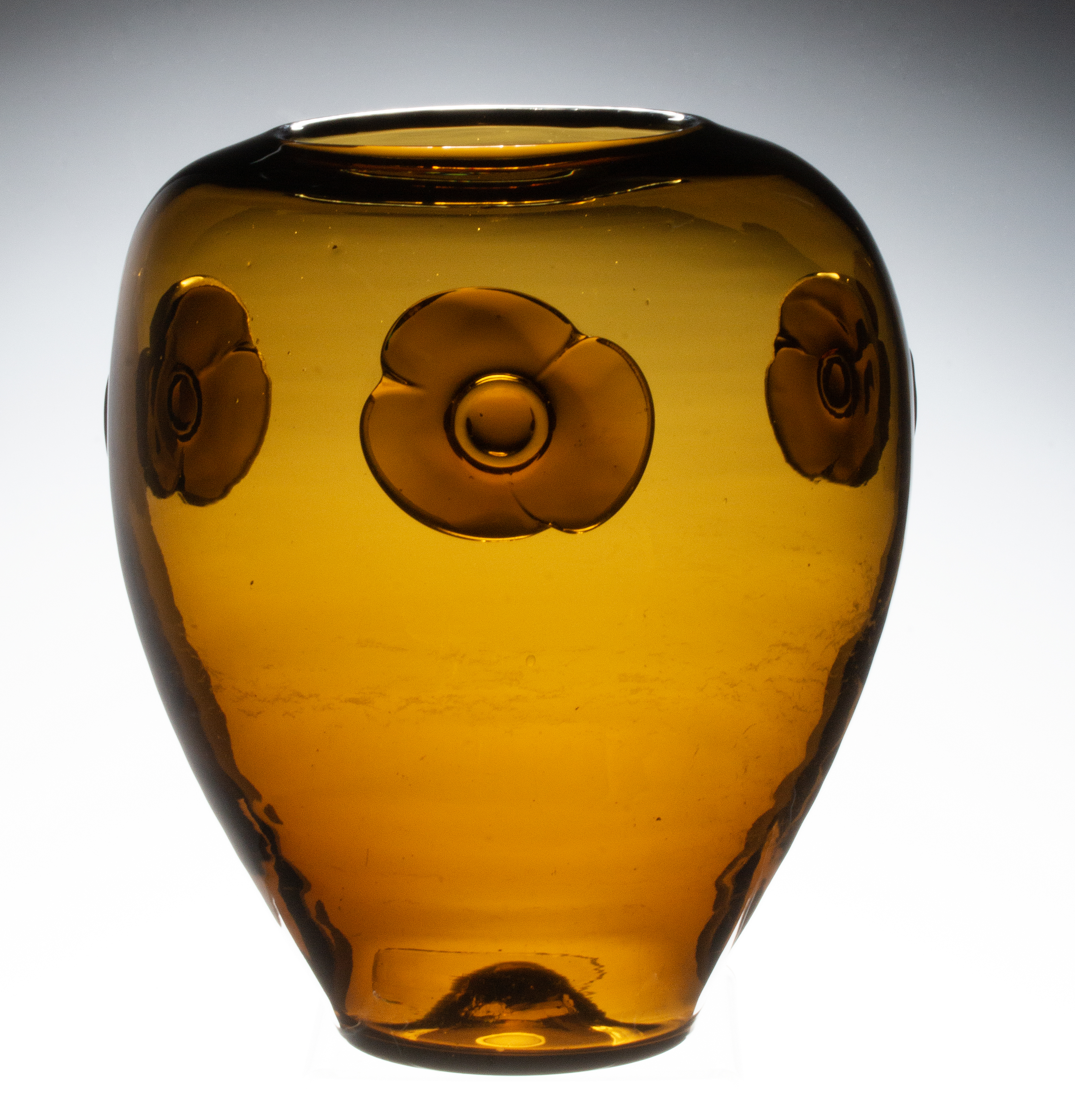 The pre-designer dark amber vase vase with rough pontil is embellished with applied glass flower heads.