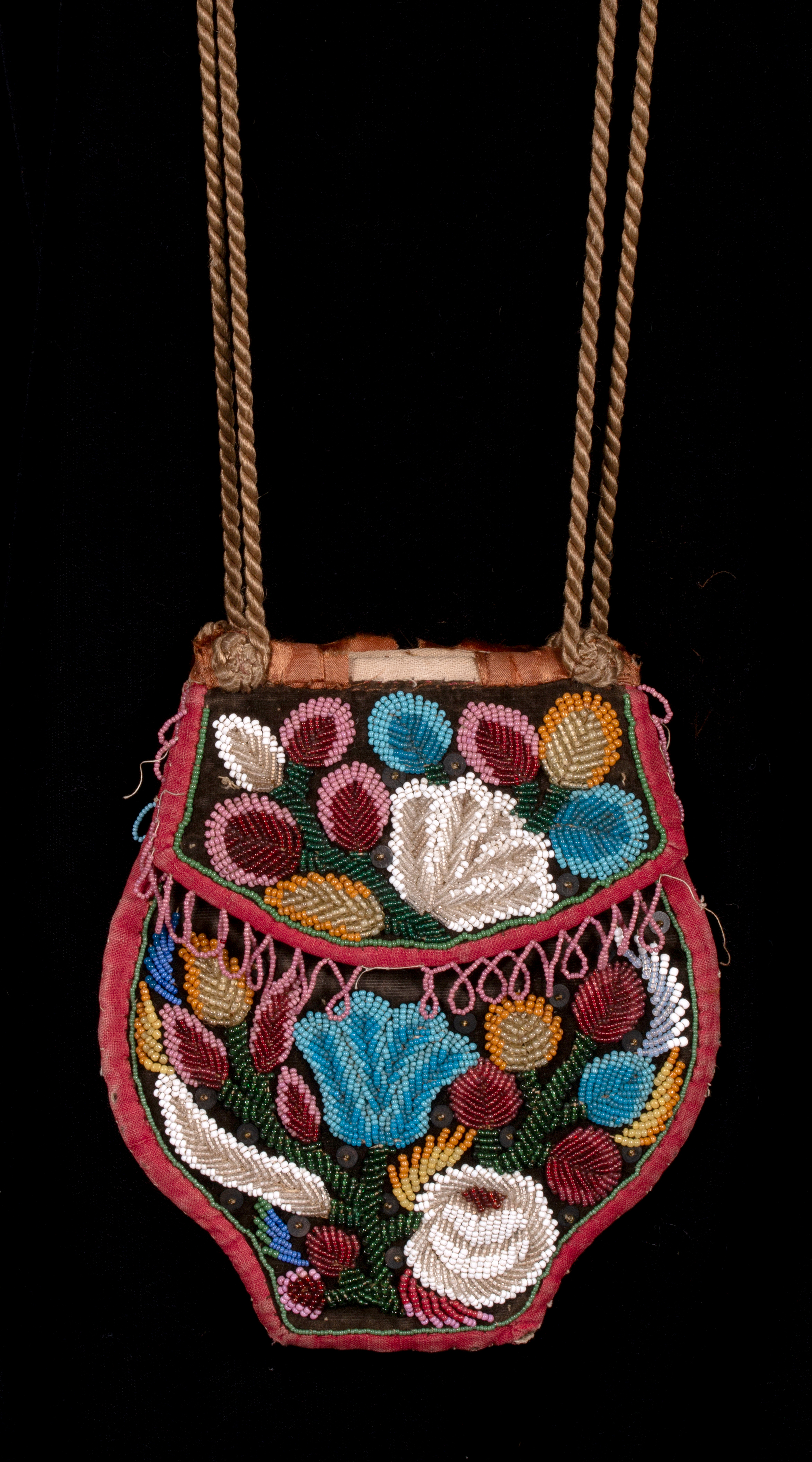 1. An Iroquois 'Niagara Falls' style beaded bag heavily beaded with elaborate floral designs and bead drops on the pouch, trade cloth interior.