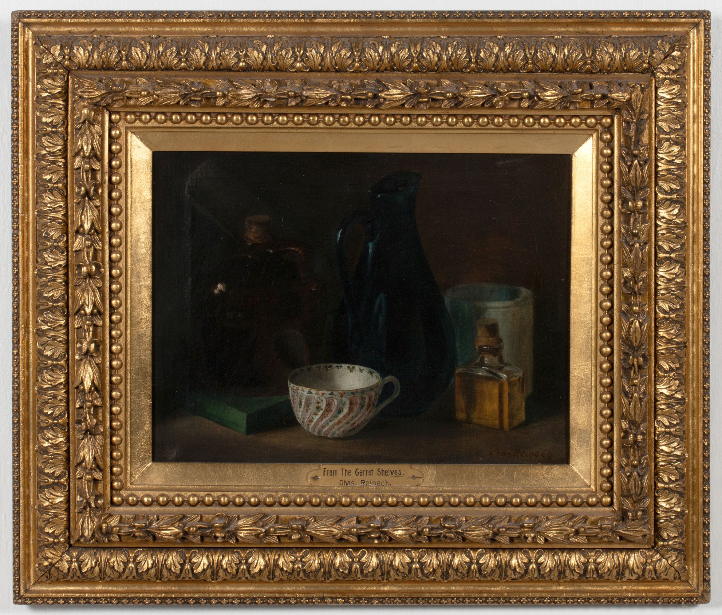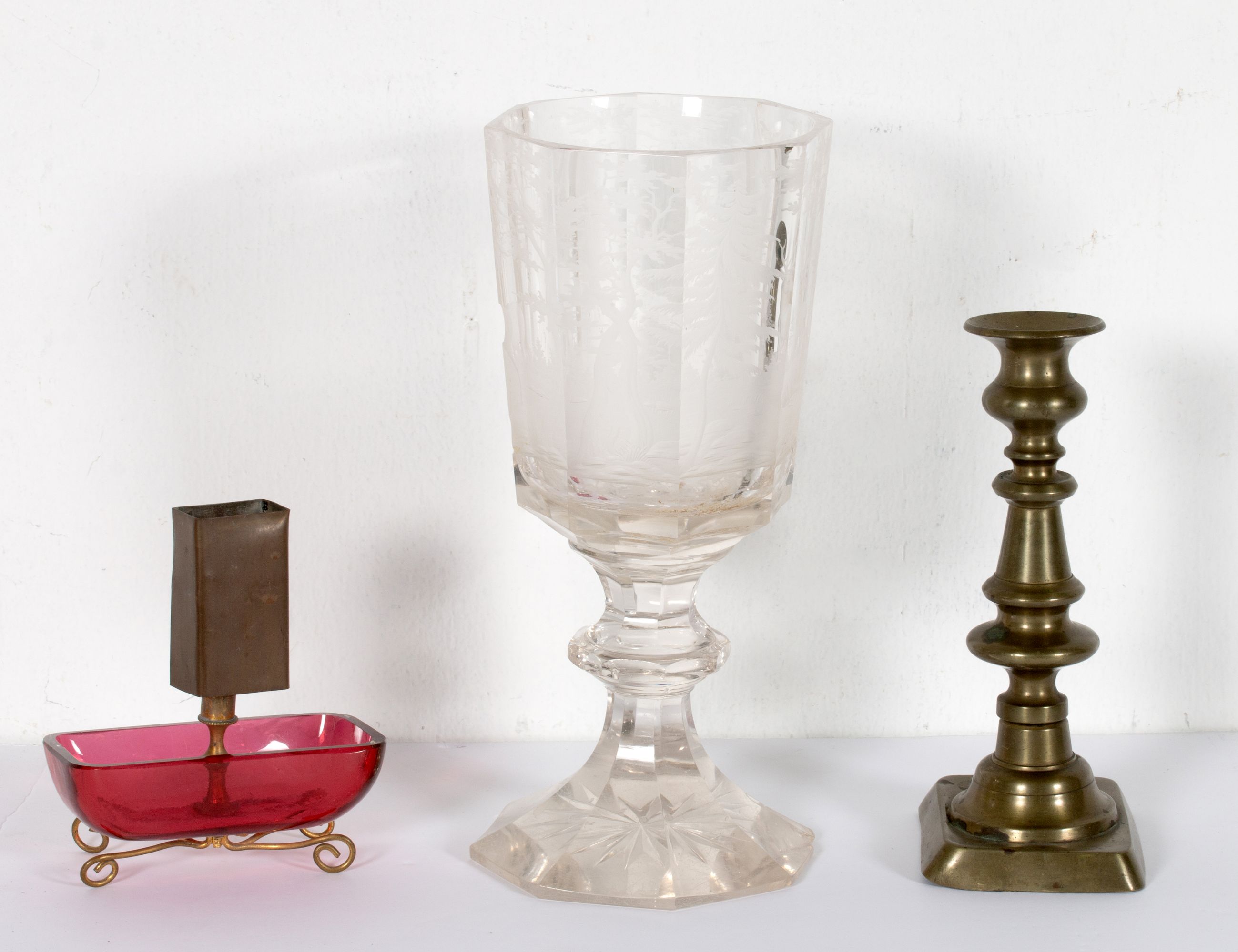 2. Three objects included in the painting compositions include an engraved Bohemian glass pokal circa 1890, a brass 'push-up candlestick circa 1830, and a cranberry glass dish in gold metal mounts.