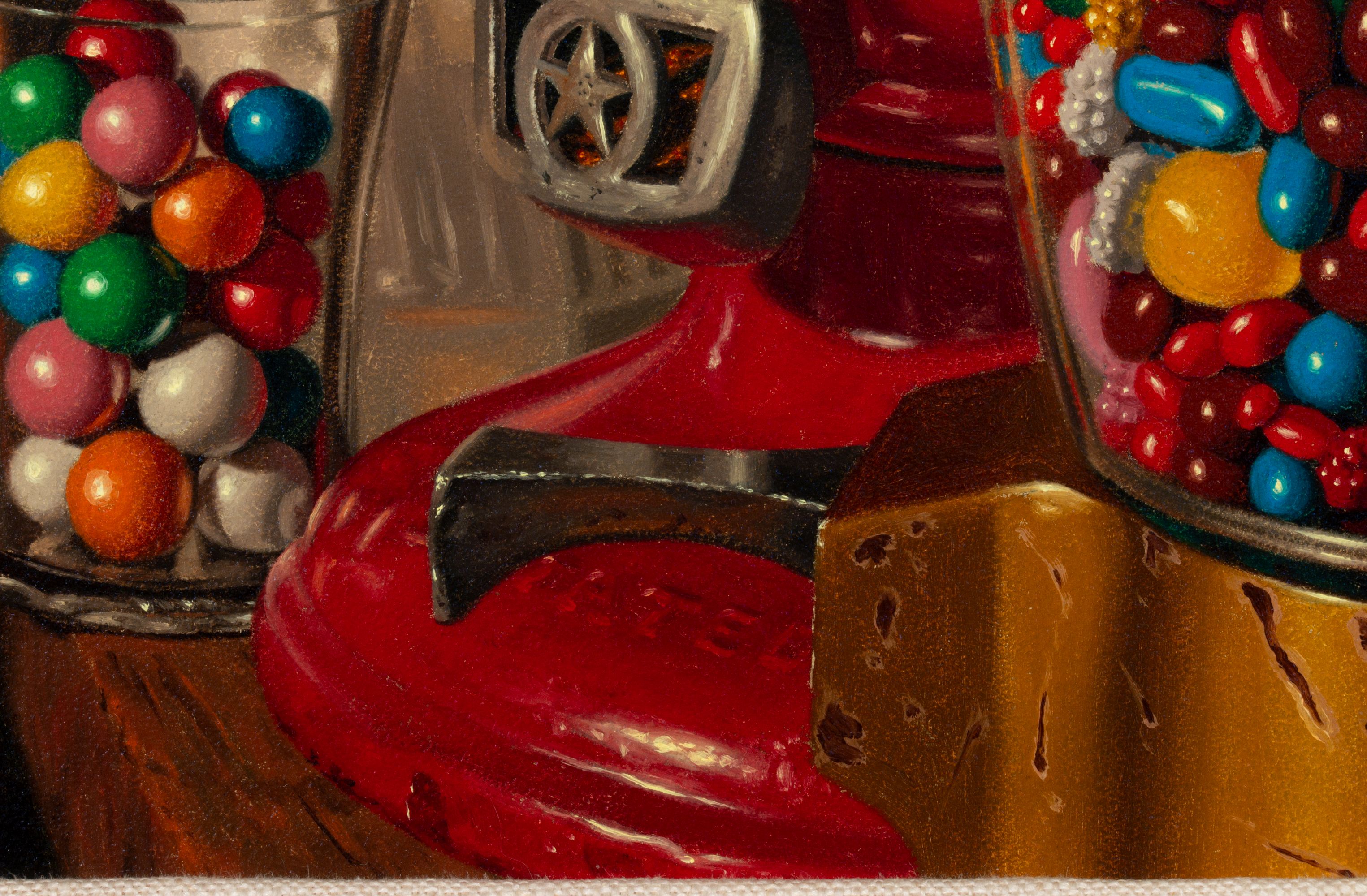 He was an avid collector of antiques, and a regular at local shows and auctions. His paintings often share themes of American nostalgia like old Country Stores and vintage Coca-Cola signs, Here, he brilliantly illuminates penny vending machines from the 1930s filled with shiny red gumballs and salty Spanish peanuts. The machines, his own, or perhaps borrowed from a fellow collector, are actual period models like the classic Art Deco style Northwestern model with white enamel on geometric iron castings, and a red Columbus 'Sanichu' Model A3 with its embossed star on the glass globe.