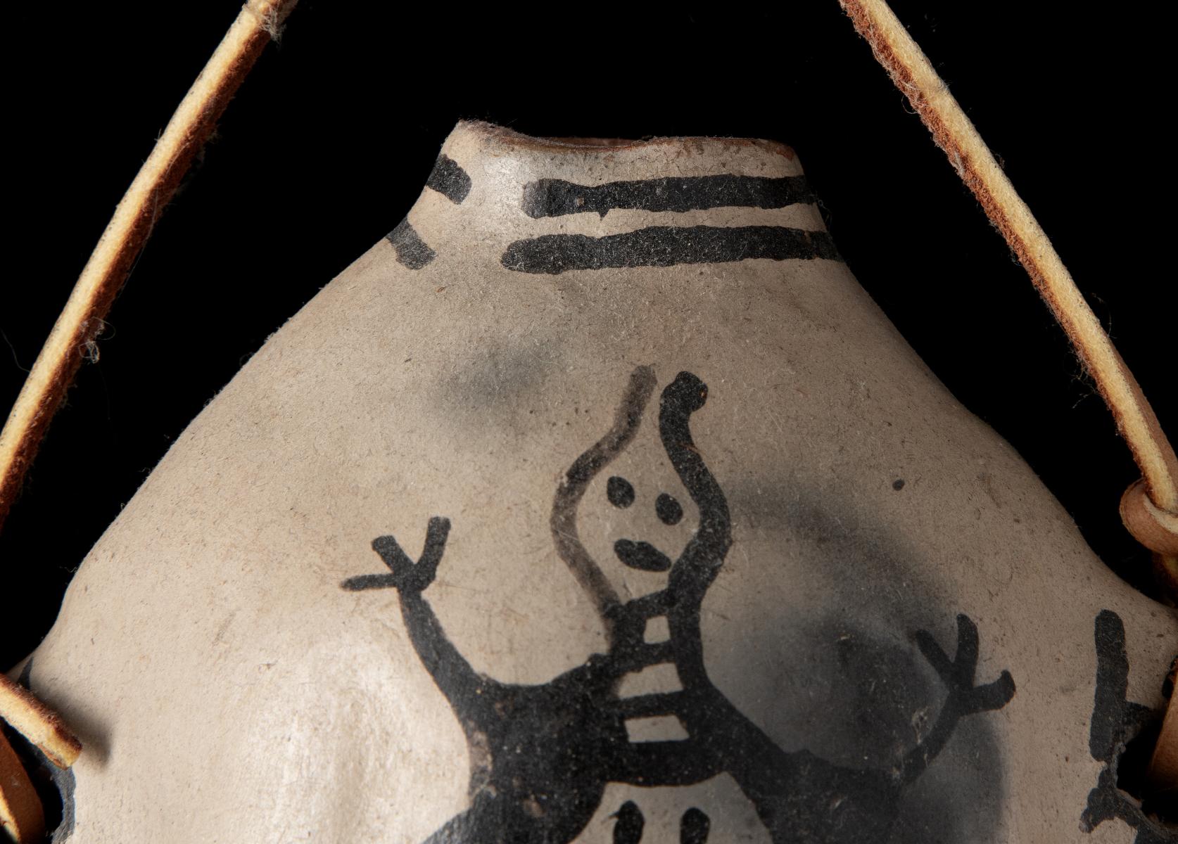 The Cochiti pottery canteen with stylized lizard in deep black on buff ground is formed and painted with the characteristics of an example of pottery made by a child in training.