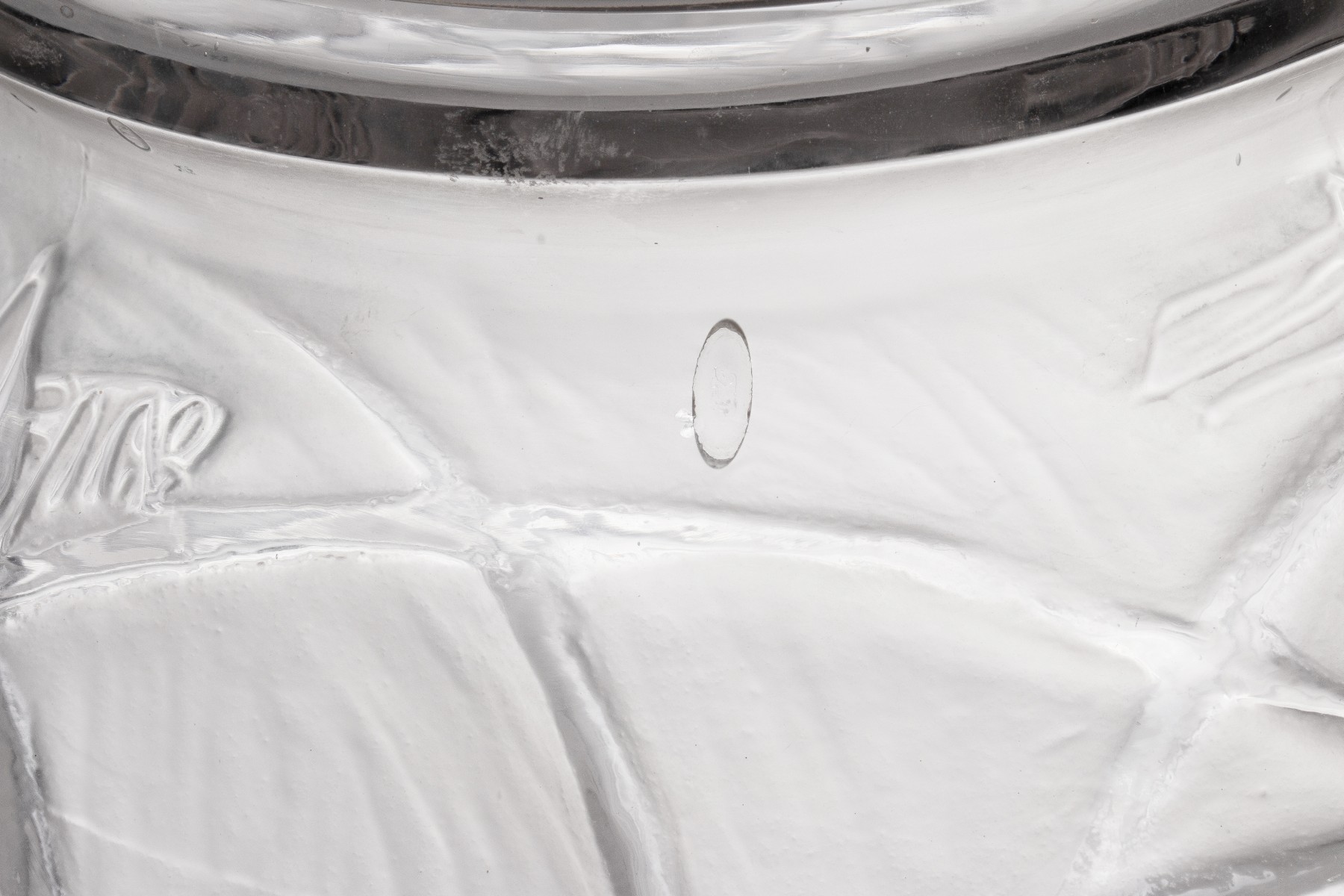 The clear and frosted vase is signed in the base with engraved signature 'R. Lalique, France.'