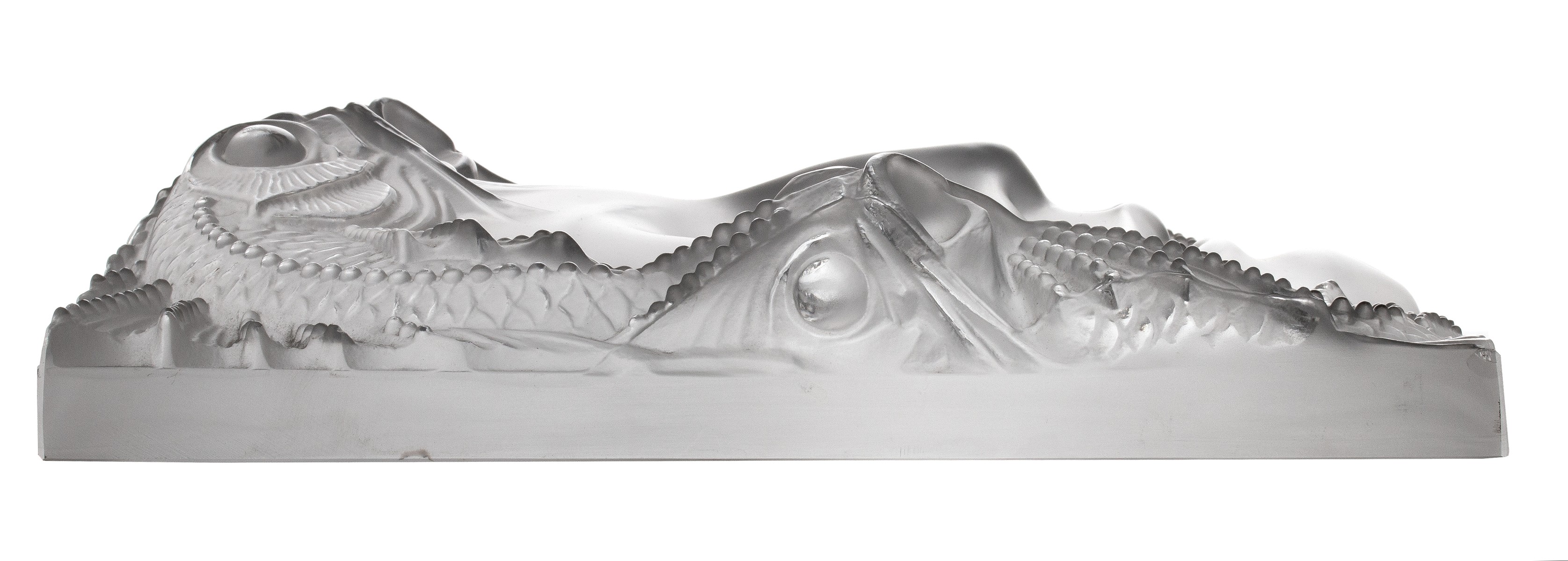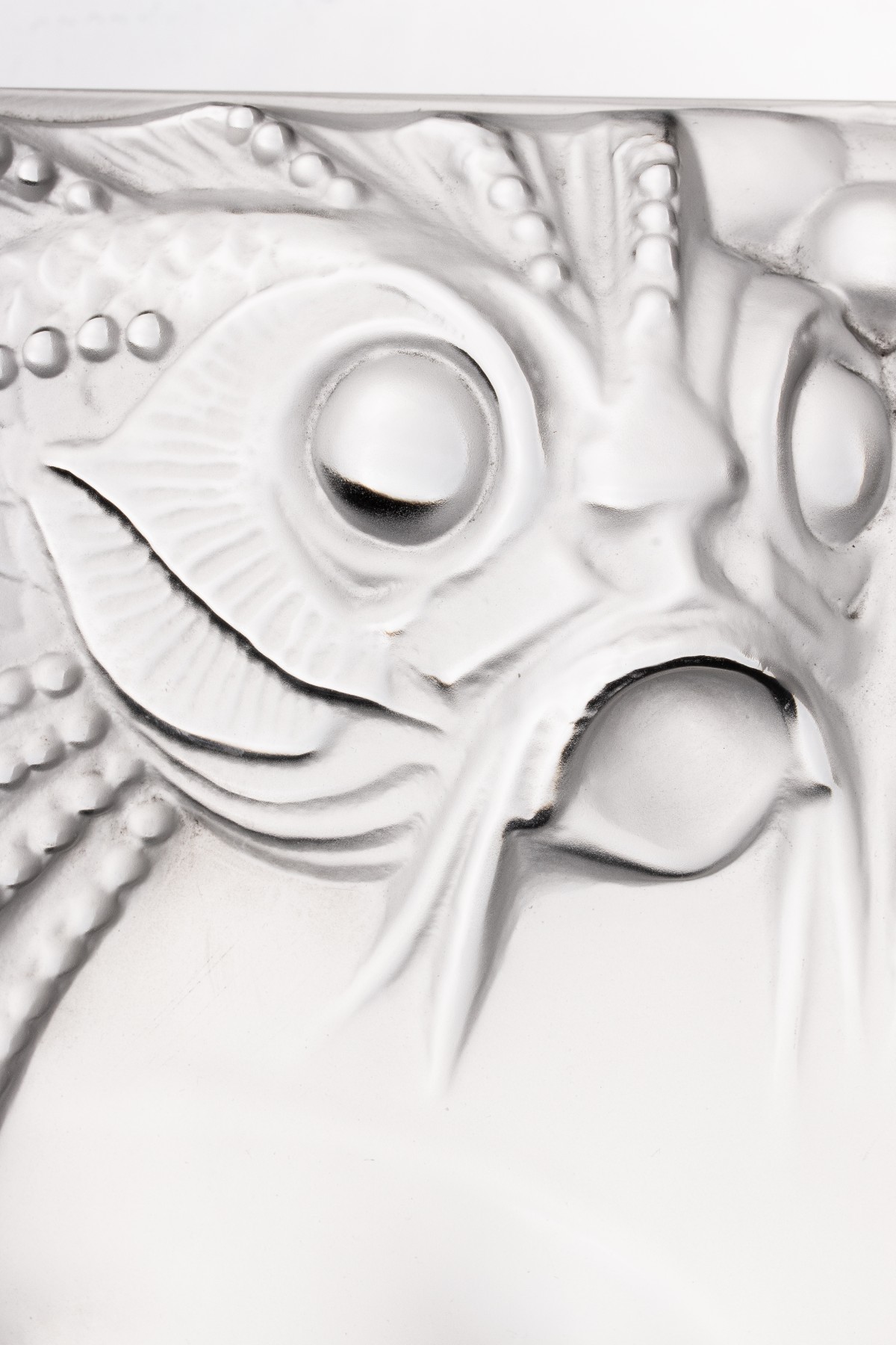 The French art glass panel is molded in very high relief and great detail of writhing dolphins framing a woman's serene visage. Portions of the plaque measure over three inches thick and the work is signed by engraved signature of 'Lalique, France.'