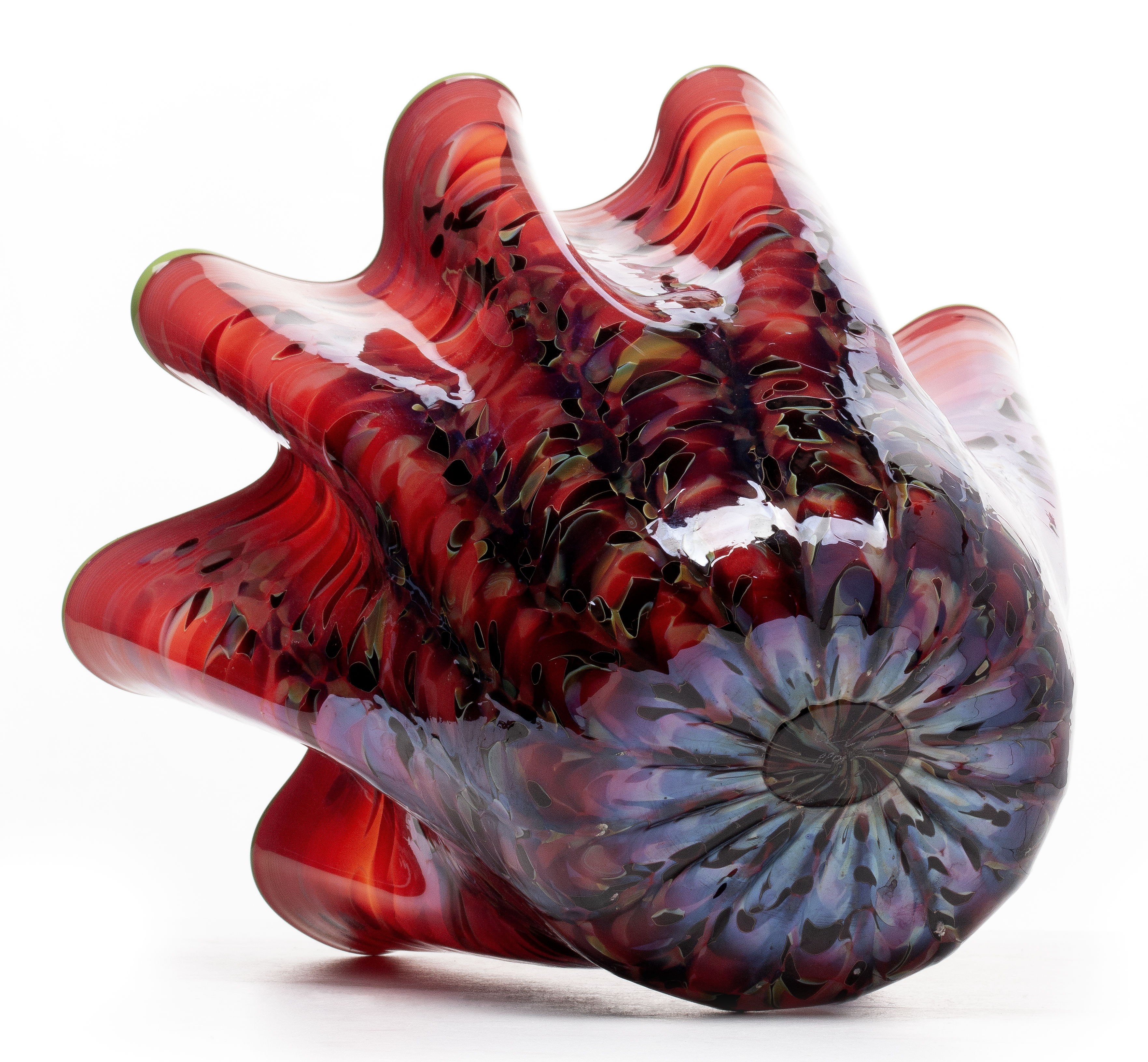 The brilliant example of Chihuly's Red Macchia technique is blown in multiple folds trimmed in a green lip wrap and signed by engraved signature on the base with the maker's number PP01.