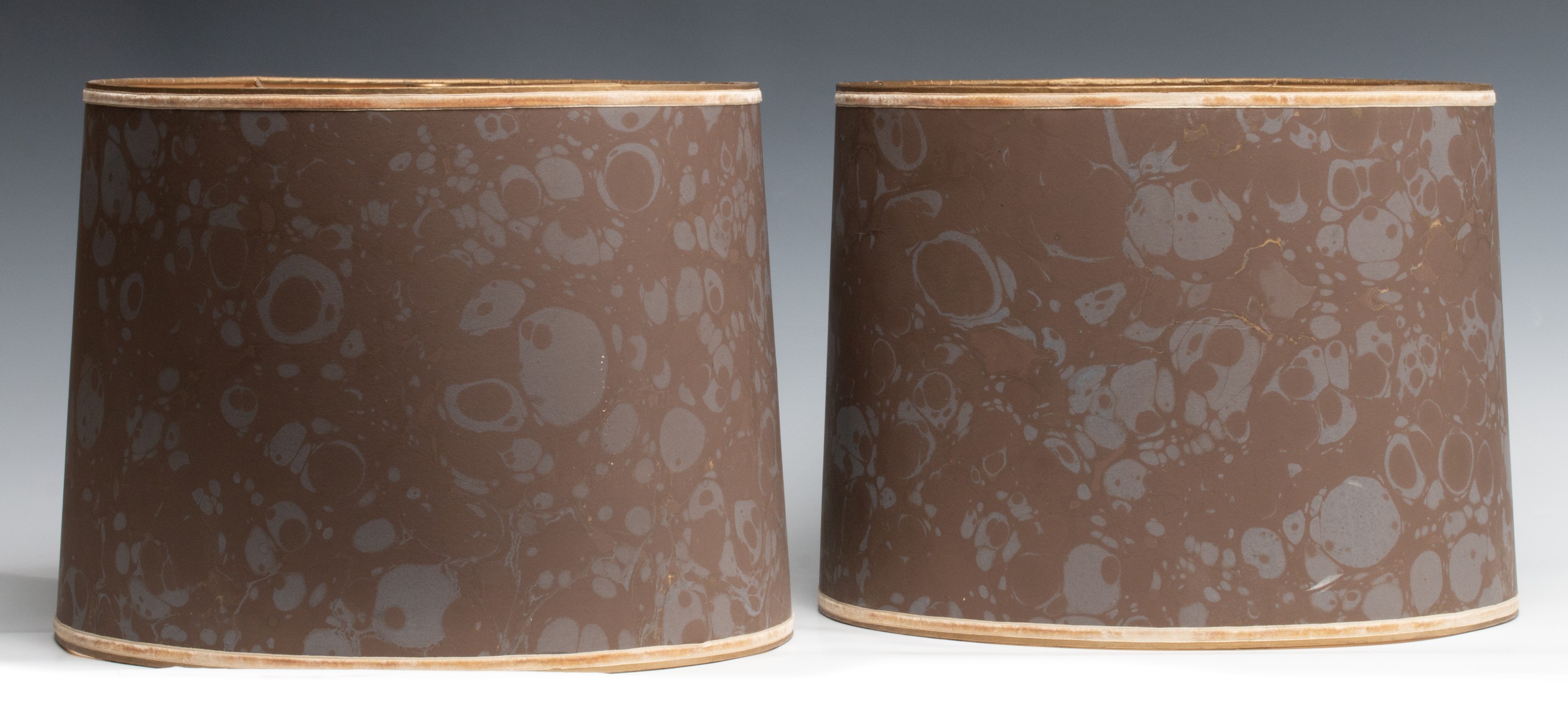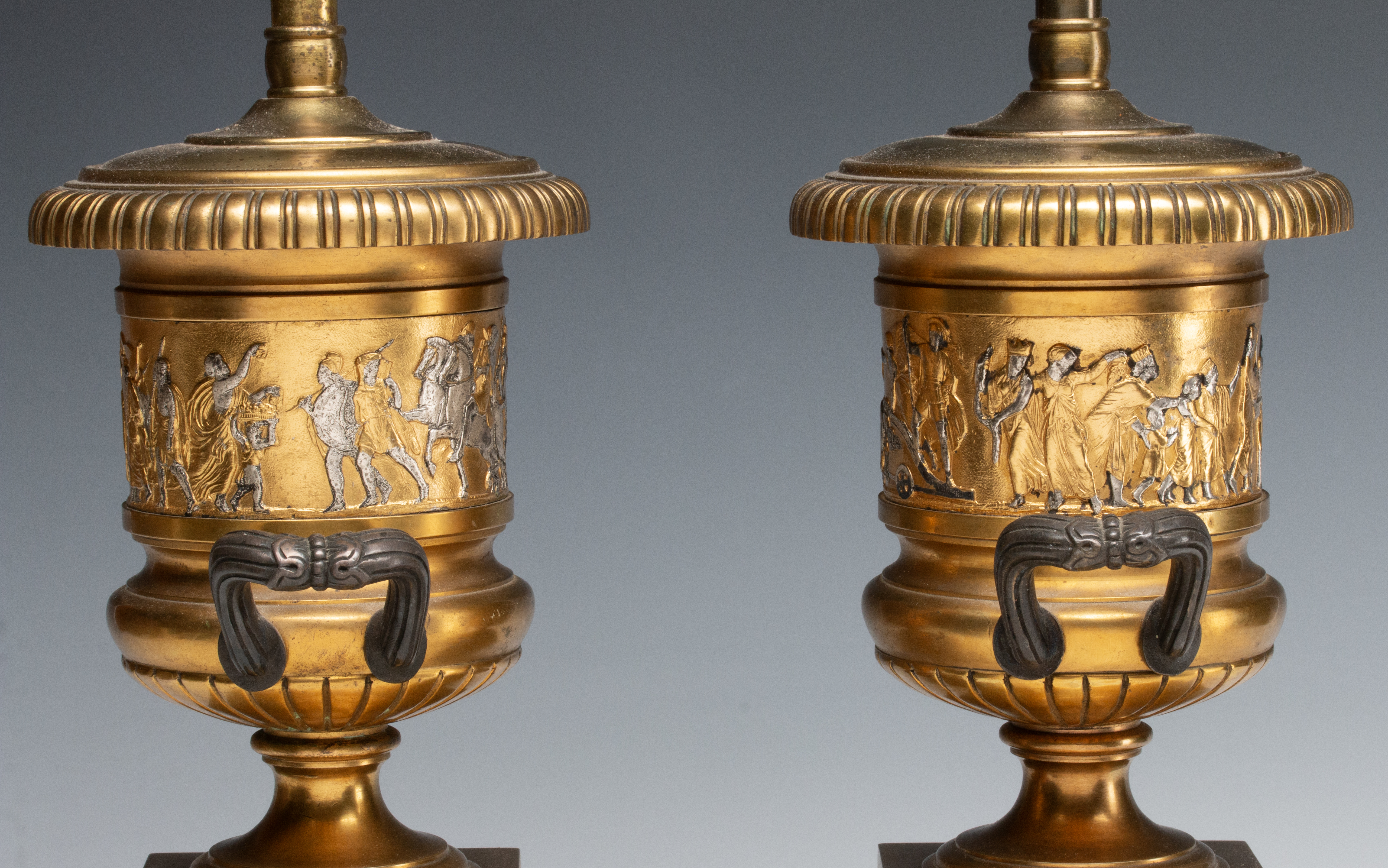 The campagna form bronze pair, each on square plinth, are finished in gold and accented with silvered highlights on figures within the encircling frieze. Two nice watermark paper shades with lightly worn gold trim.
