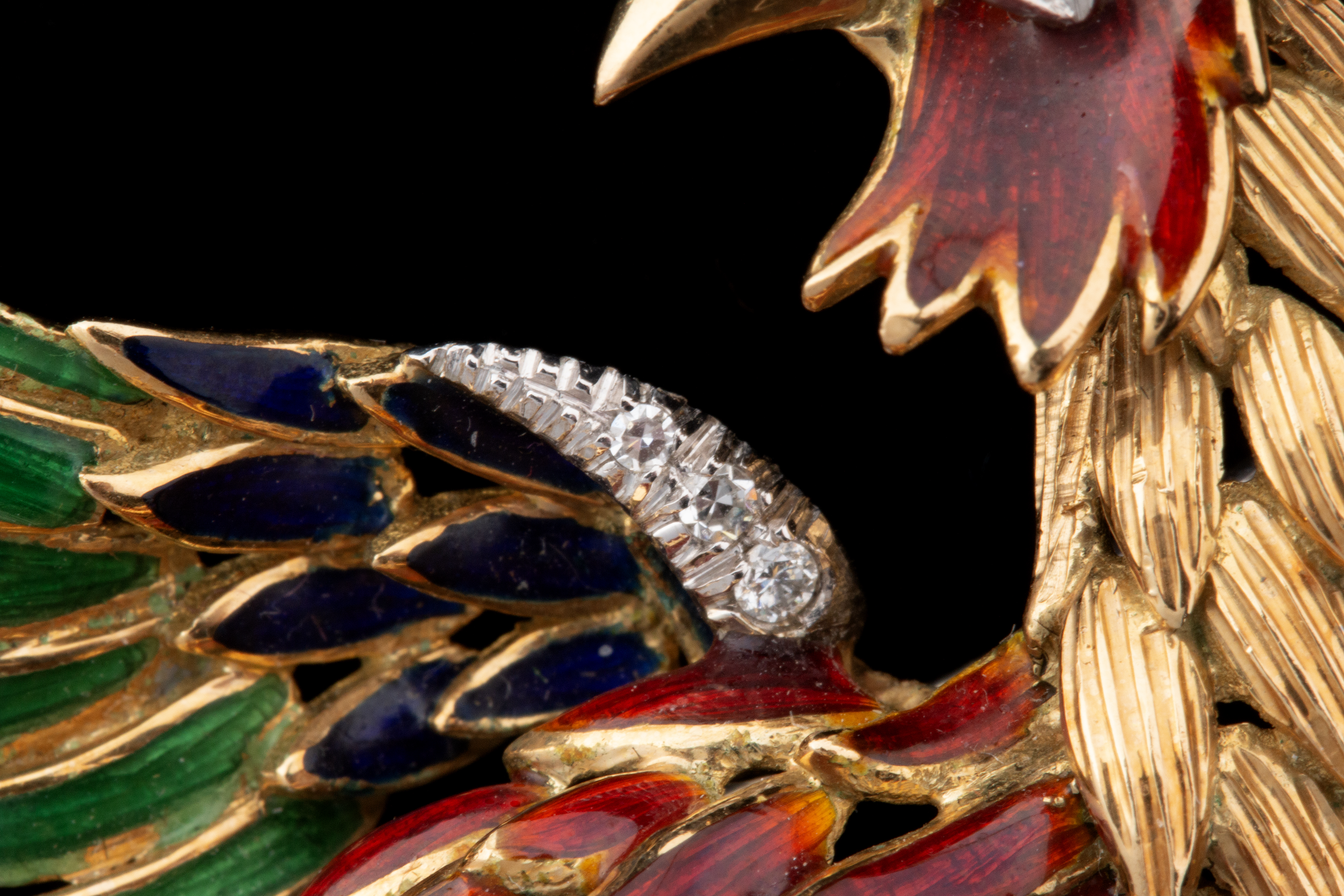 The 18k gold brooch with diamonds and multiple colors of fired on enameling is attributed to the 1970's goldsmith Lunati. The work is marked 750, the total weight equals 32 grams.
