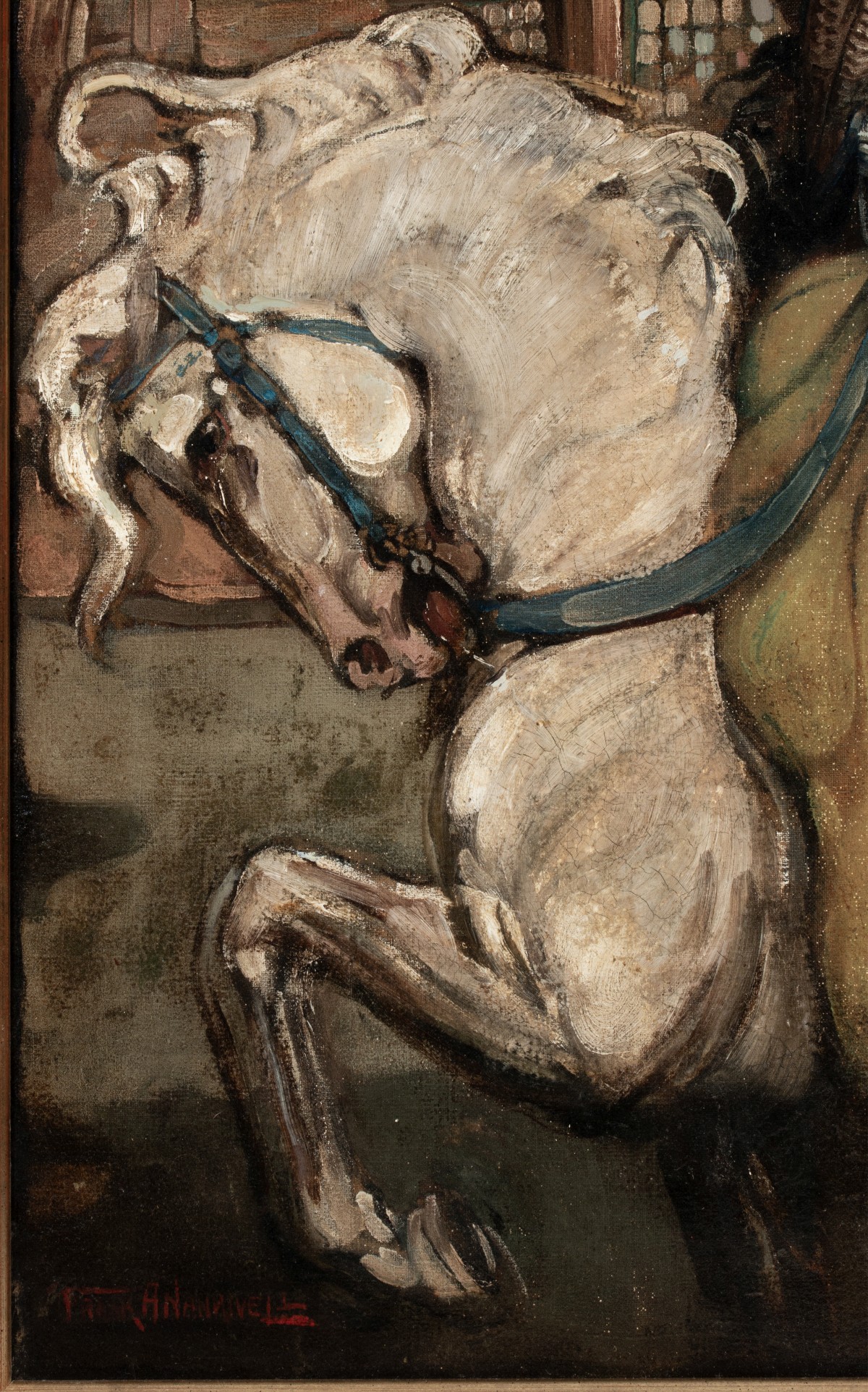 The depiction of a young lady falconer on horseback with hooded a Peregrine on her arm is signed lower right in red pigment The style is reminiscent of many painters of early 20th century American illustration art, particularly those from the Brandywine school for its storybook quality if nothing else.