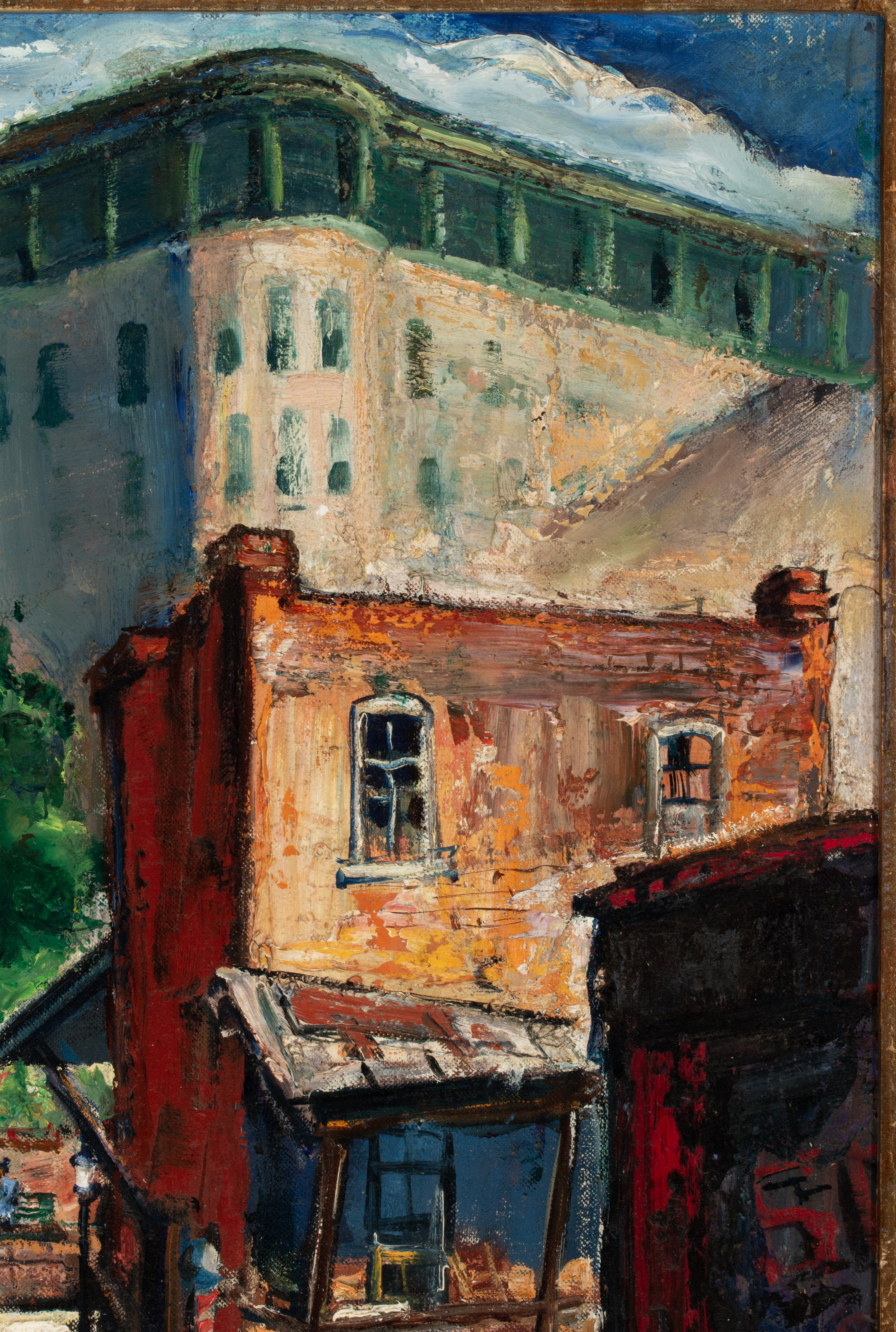 The prototypical 1930s American Scene image of Regionalist identity depicts the stately and elegant Crescent Hotel above a time-worn and somewhat dilapidated neighborhood of Eureka Springs, Arkansas. The work is signed lower right front and displayed in a nicely suited contemporary frame.