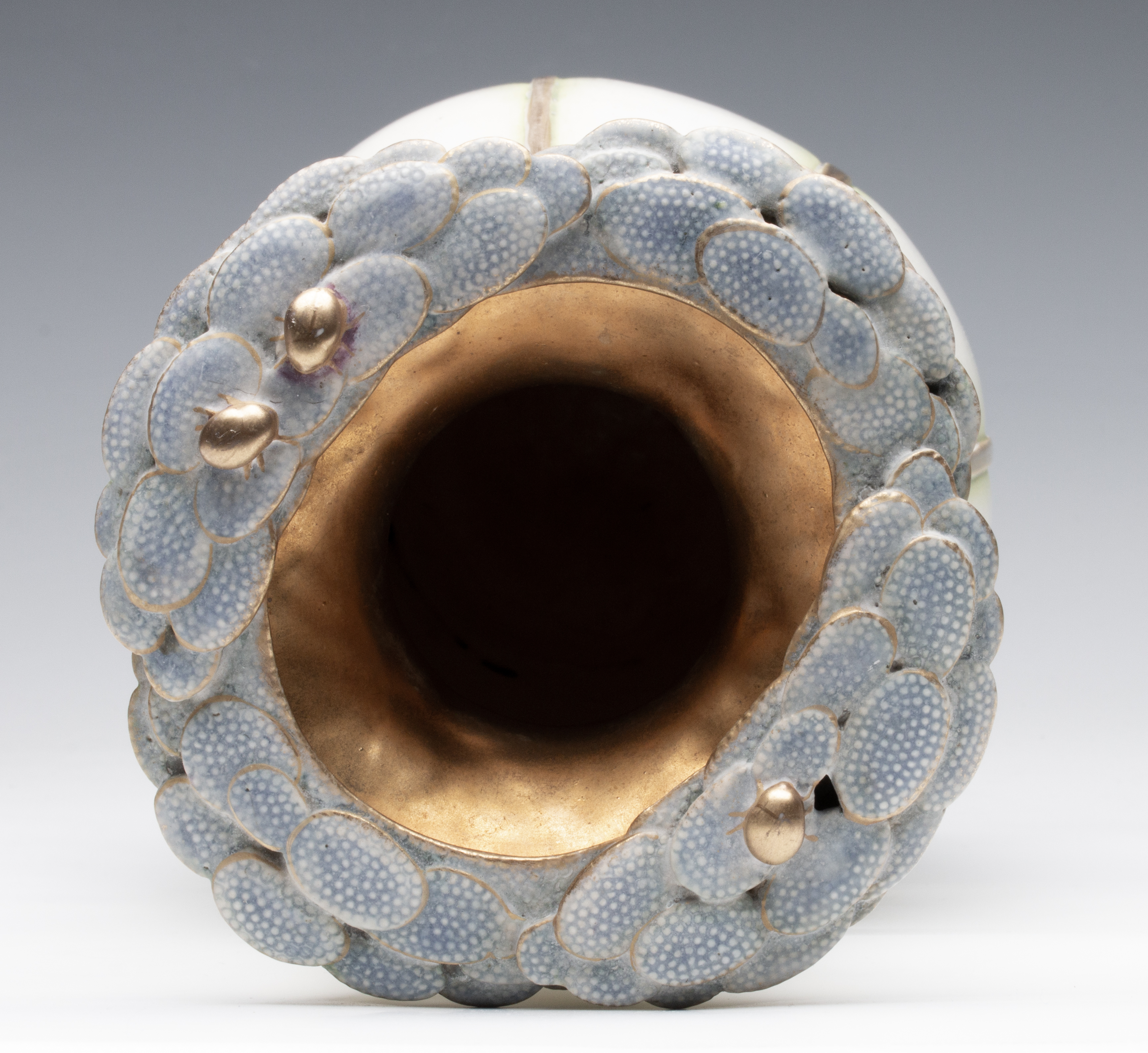 Its baluster form displays organic motifs encircling the base, with rising tendrils that join clusters of stems ending in layered stacks of pebbled blue pods attended to by three ladybugs in gold, the blue flower head pods encircle the gilded throat interior of the vase. The base is signed with the purple Turn Teplitz PD mark for designer Paul Dachsel.